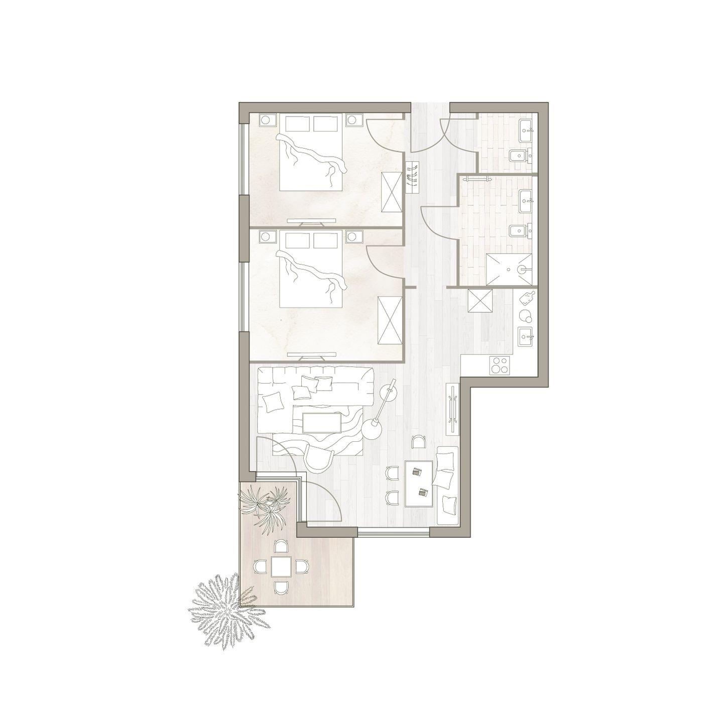 Ein möblierter Balkon mit West-Ausrichtung bietet Sonne bis in den Abend hinein. Die zwei Schlafzimmer sind mit je einem komfortablen Doppelbett, Schrank und Smart TV ausgestattet. Zudem verfügt das Apartment über ein modernes, mit anthrazitfarbenen Natursteinfliesen gestaltetes Badezimmer und ein separates WC.