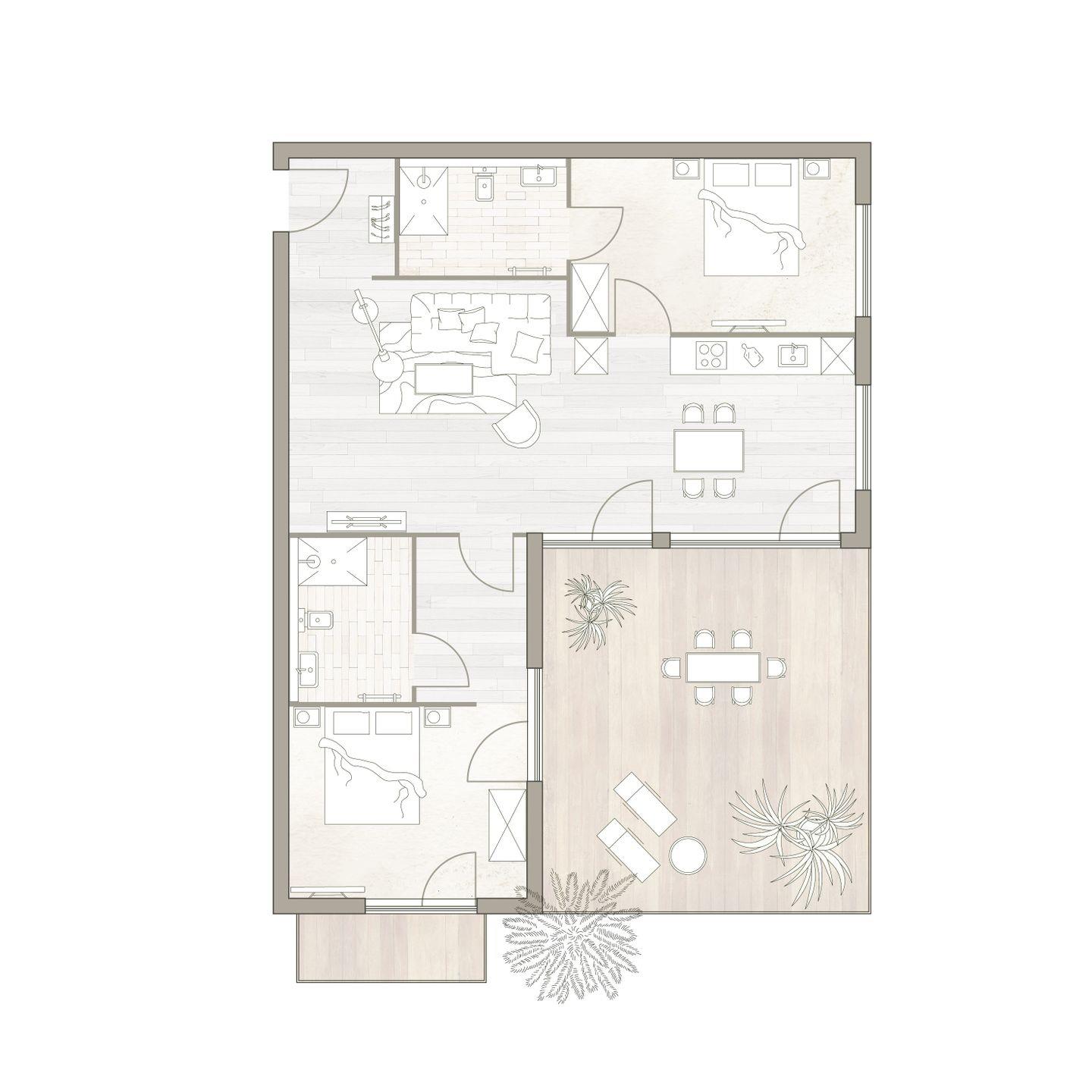 Die zwei Schlafzimmer sind mit je einem komfortablen Doppelbett, Schrank und Smart TV ausgestattet. Jeder Schlafraum verfügt über ein eigenes, mit Natursteinfliesen gestaltetes Bad, das Hauptschlafzimmer zudem über einen eigenen Balkon.