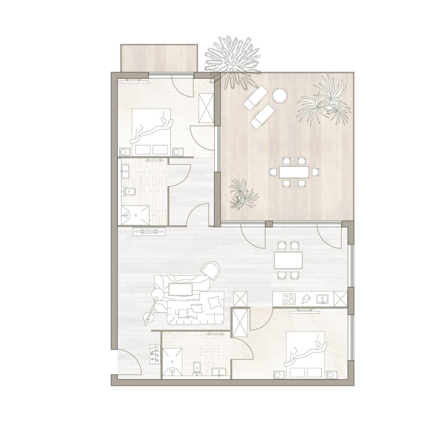 Auf der großzügigen, möblierten Dachterrasse lässt sich der Urlaubstag mit einem Frühstück in der Sonne beginnen. Die zwei Schlafzimmer sind mit je einem komfortablen Doppelbett, Schrank und Smart TV ausgestattet.