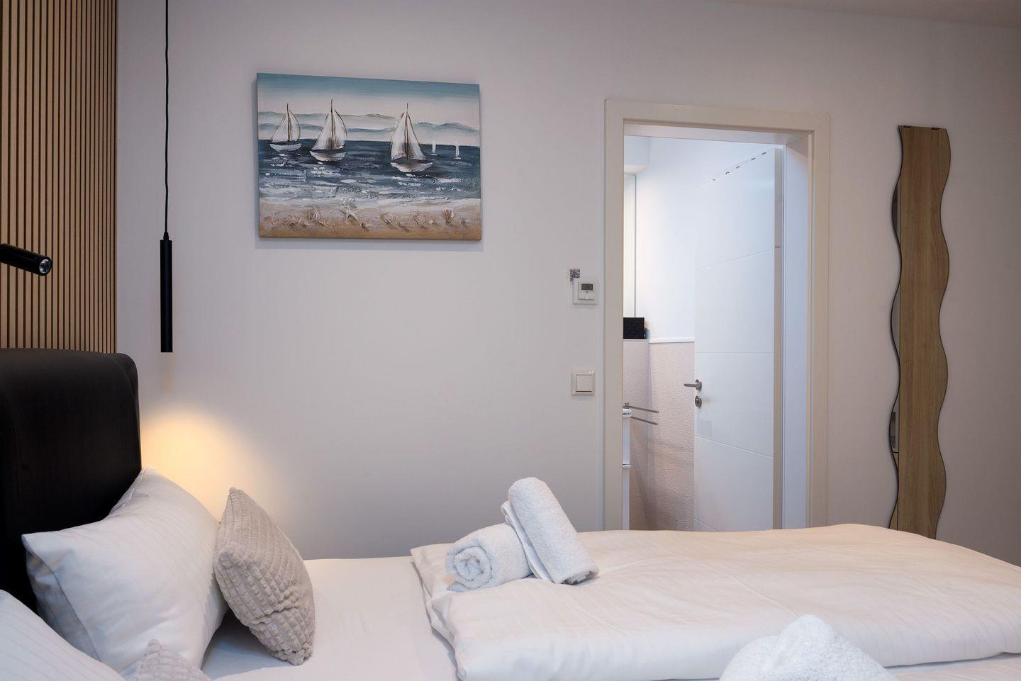 Unsere Gäste haben Zugang zur gesamten Ferienwohnung inklusive Wohnzimmer, zwei Schlafzimmern mit Balkon und Meerblick, dem großzügigen Badezimmer mit Dusche und Badewanne sowie einem separaten WC im Saunabereich.