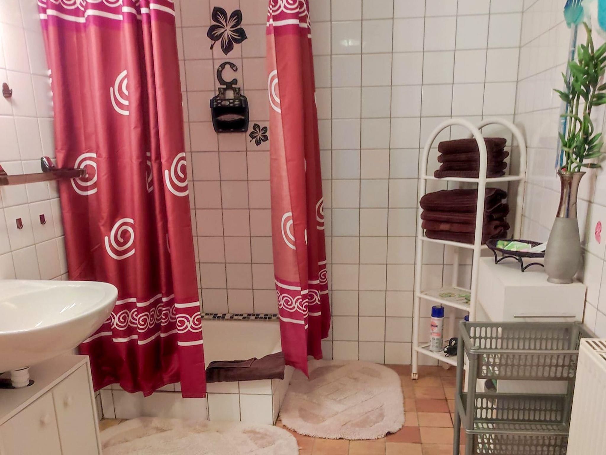 - Das Badezimmer ist mit Dusche, Toilette, Waschtisch und Fön ausgestattet.