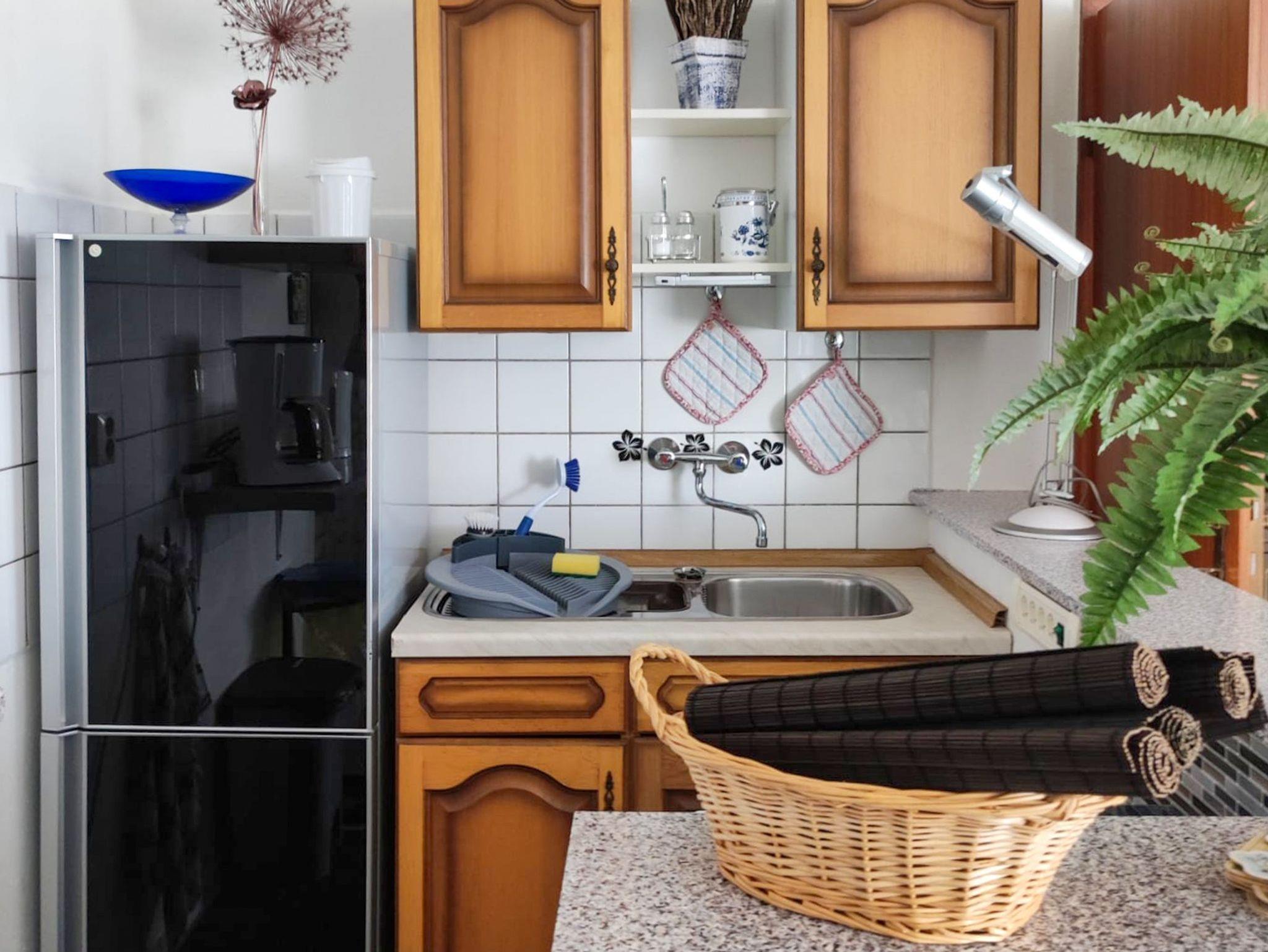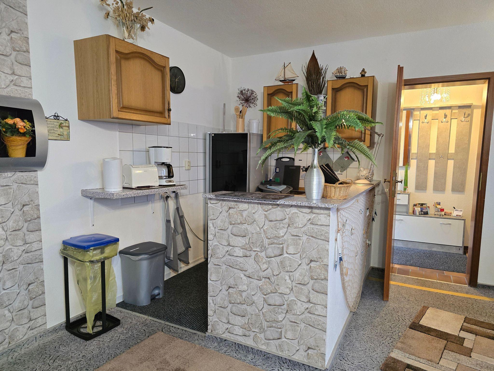 - Die Küche verfügt einen Kühlschrank mit großem Gefrierfach, Herd und Backofen und zusätzlichen Küchenutensilien.
