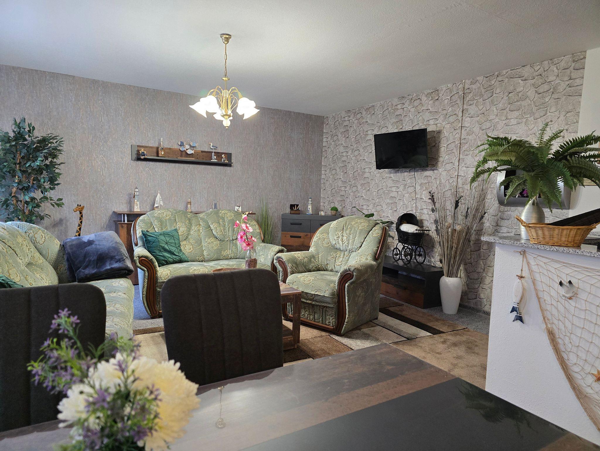 - Das Wohnzimmer ist mit einer Couchgarnitur, Fernseher und offener Küchenzeile ausgestattet.