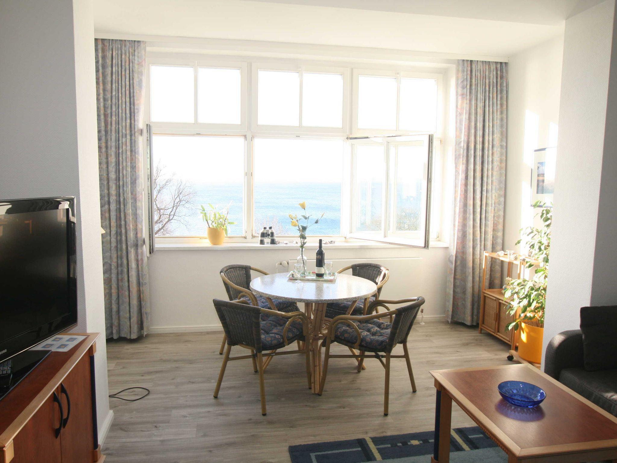 Im Wohnzimmer befindet sich ein Schreibtisch, eine gemütliche Wohnlandschaft, die dann auch für 2 Aufbettungen genutzt werden kann, einen grossen Flatscreen-TV und eine Multifunktionanlage, mit der Sie auch CD' s & DVD's abspielen können. Wir leihen Ihnen auch gerne eine DVD über die schöne Insel Rügen aus.
