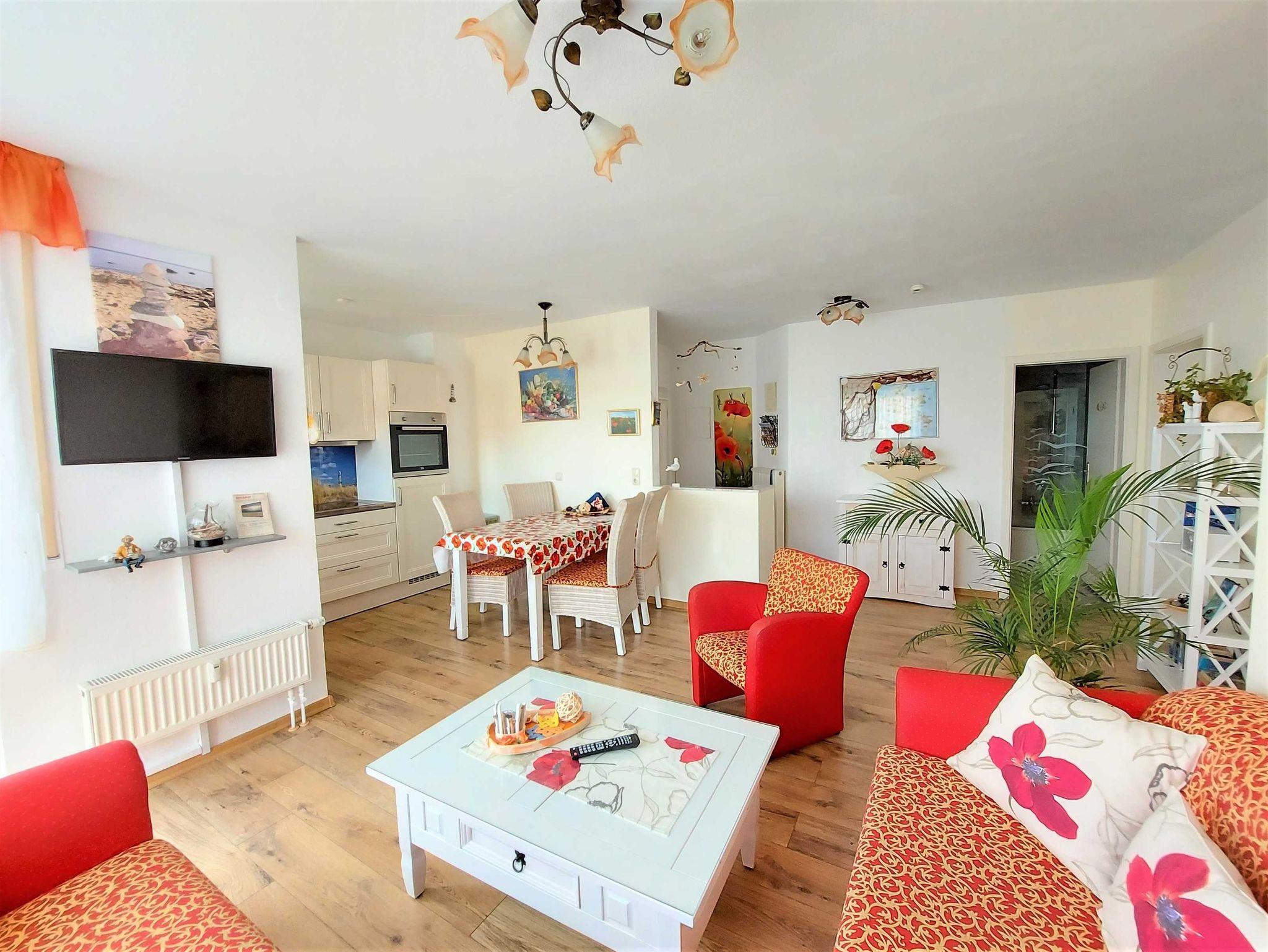 Diese Komfort-Ferienwohnung befindet sich in bevorzugter Lage am Hochufer im ersten Stock eines gepflegten Apartmenthauses in ruhiger Lage aber sehr Zentral. Sie verfügt über einen großen lichtdurchfluteten Wohnraum mit 2 gemütlichen Sofas, Sessel und Hocker die zum Sat.- Fernsehen oder zum Musikhören einladen,oder gehen sie von hier auf den Balkon mit schönen Holzmöbeln und Sonnenschirm und geniessen zb. leckeren Fisch den sie gerade am Hafen direkt vom Fischer geholt haben und in der kompletten Einbauküche mit allem Komfort , wie Geschirrspüler,Mikrowelle,Ceranfeld,Kühl-Gefrierkombi usw mit Freude zubereiten können.Angrenzend ist der Esstisch mit 4 gemütlichen Stühlen..Die Nacht geniessen sie im grosszügigen Schlafzimmer mit neuem Designerboxspringdoppelbett und 2. Balkon und im zweiten Schlafzimmer mit 2 Einzelbetten.Im Bad erwartet sie zum Entspannen eine Wanne. Auch ihr Auto hat einen eigenen PKW-Stellplatz auf dem Hof.