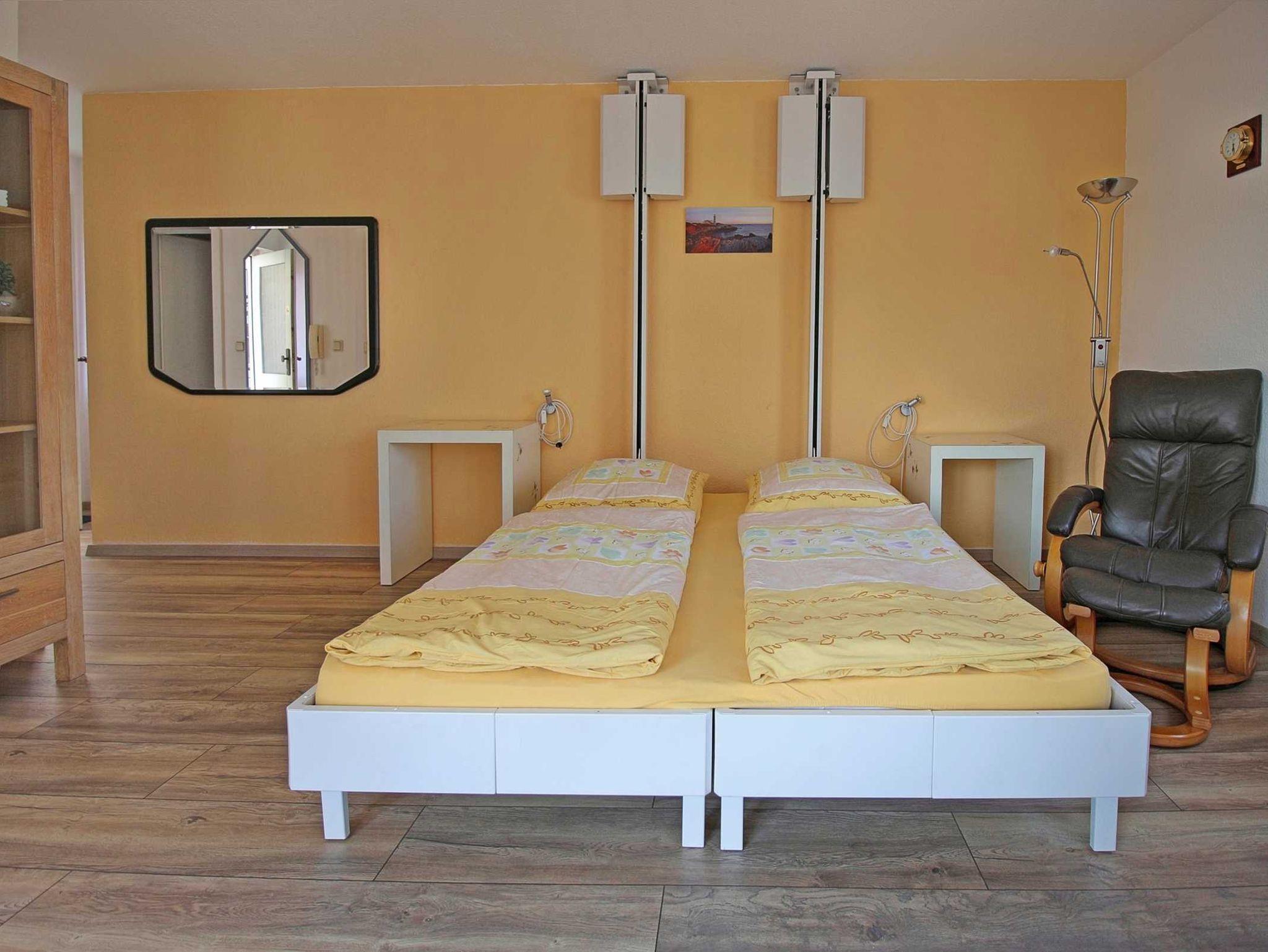 - Kombinierter Wohn-Schlafraum mit Schrankbett (1,60 m x 2,00 m, getrennte Matratzen), Sitzecke mit 2 Relaxsesseln, Couch, Flachbildfernseher, Stereoanlage, DVD-Player, Kleiderschrank