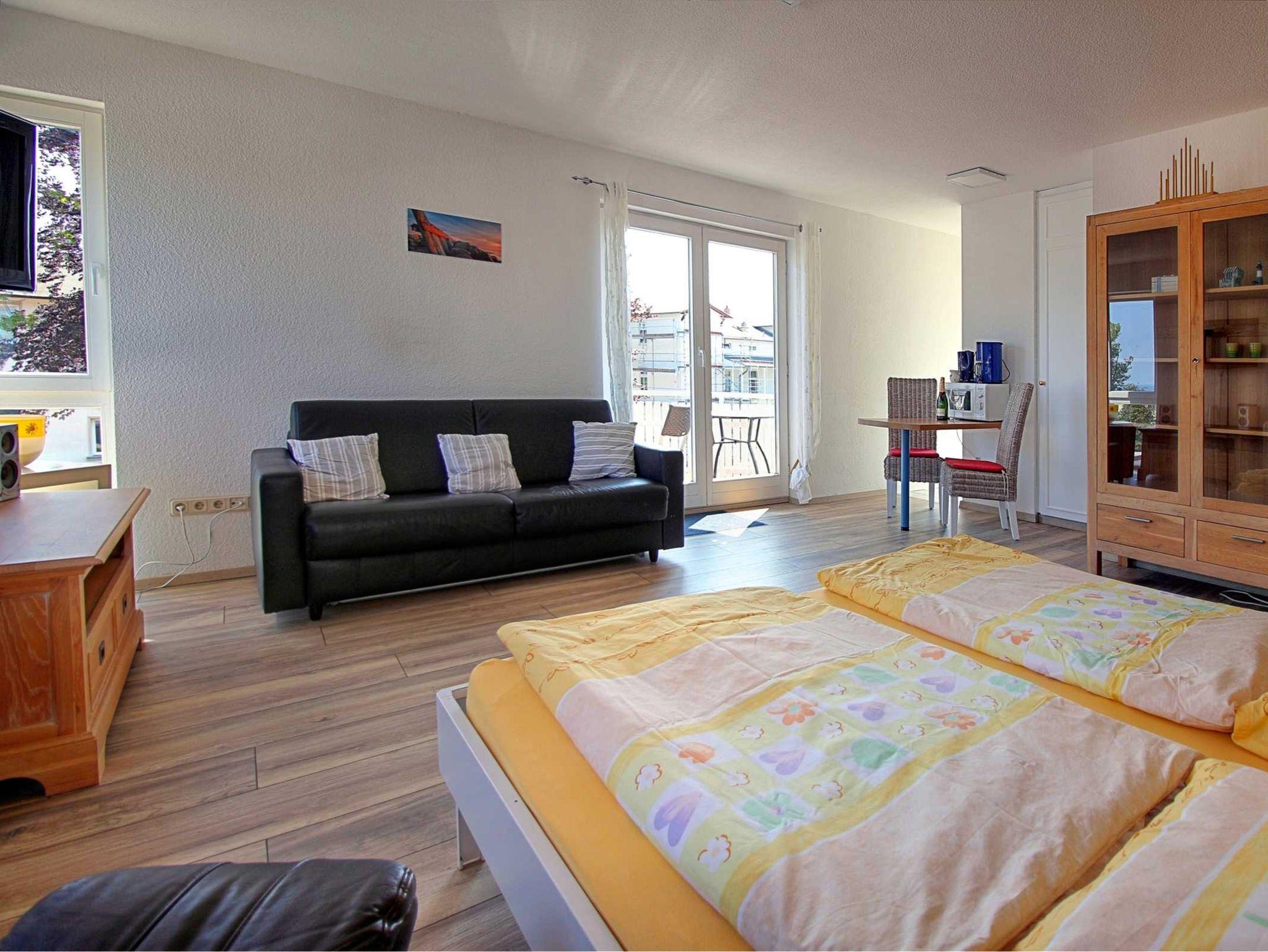 Vom Wohn-Schlafraum aus gelangen Sie auf den sonnigen Süd-Balkon, von dem aus Sie auch einen kleinen seitlichen Blick auf die Ostsee haben.