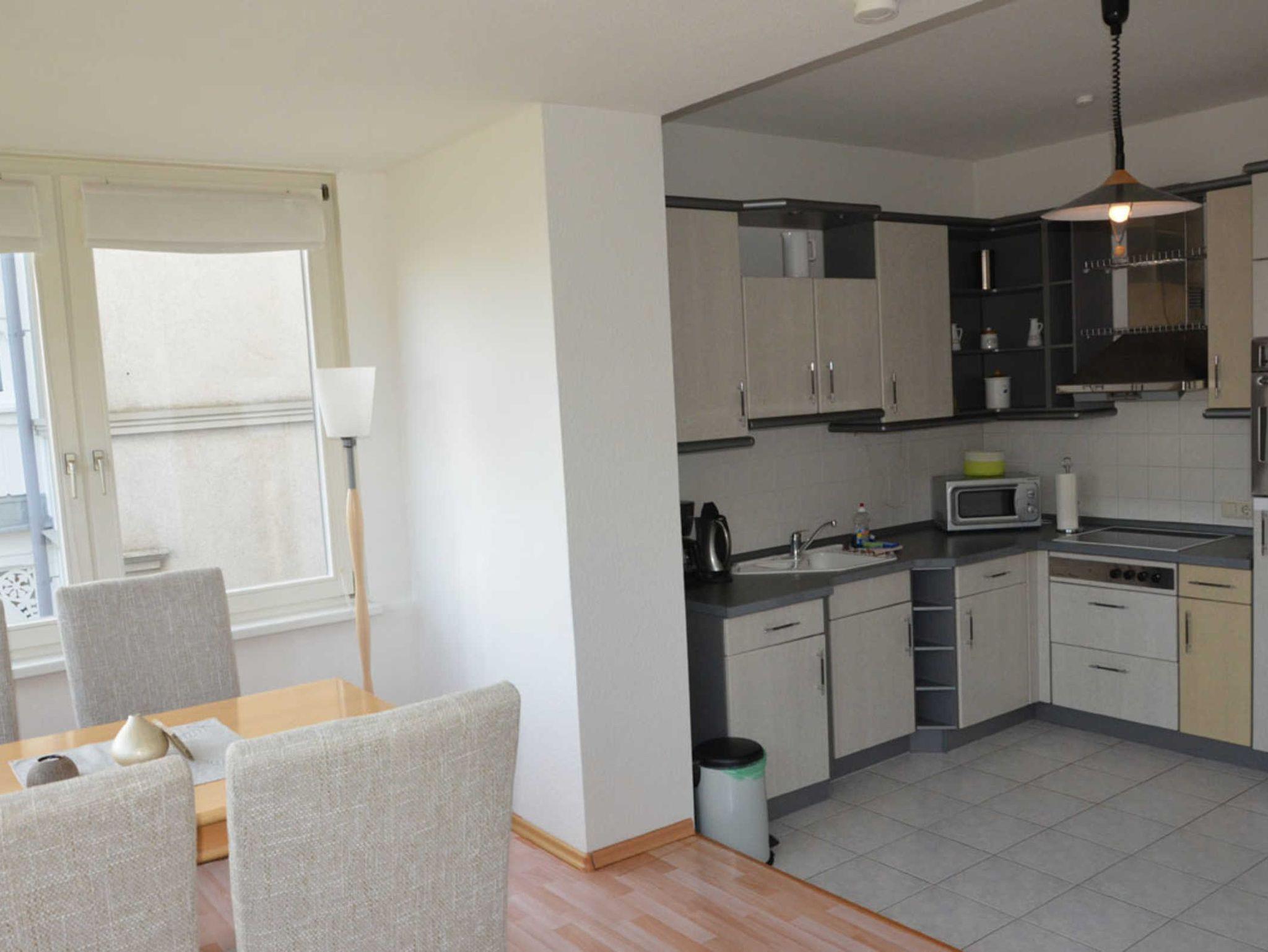 Außerdem besitzt die Wohnung eine komplett eingerichtete Küchenzeile. Eine Terrasse mit Gartenmöbeln ist ebenfalls vorhanden.