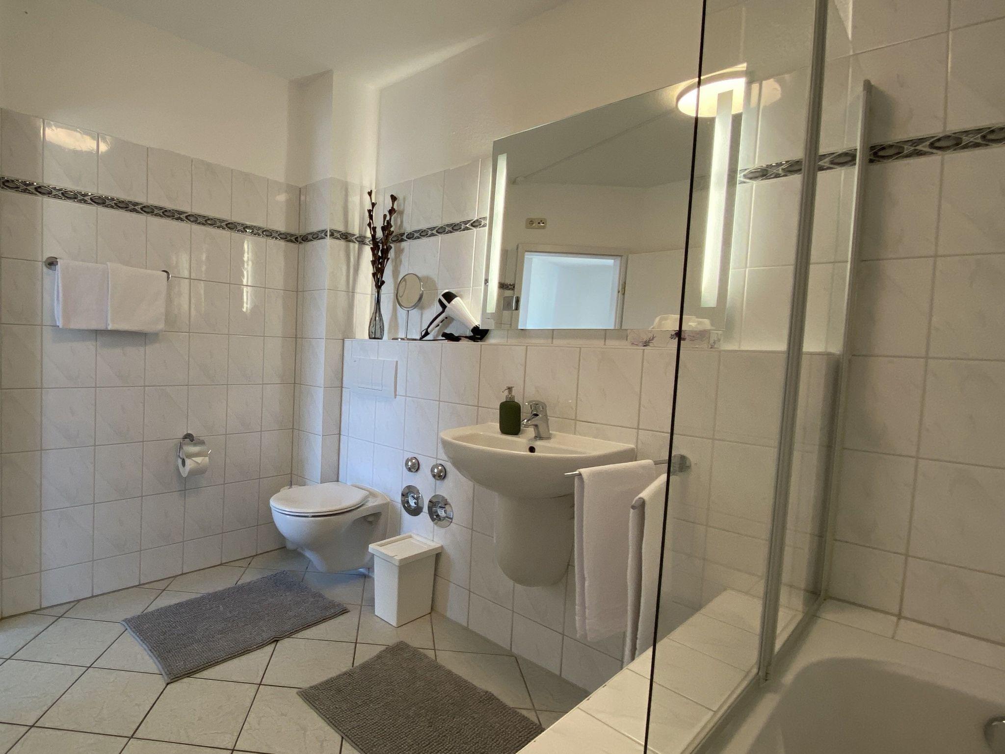 Bad mit Dusche, WC, Waschbecken, großer beleuchteter Spiegel, Schminkspiegel.