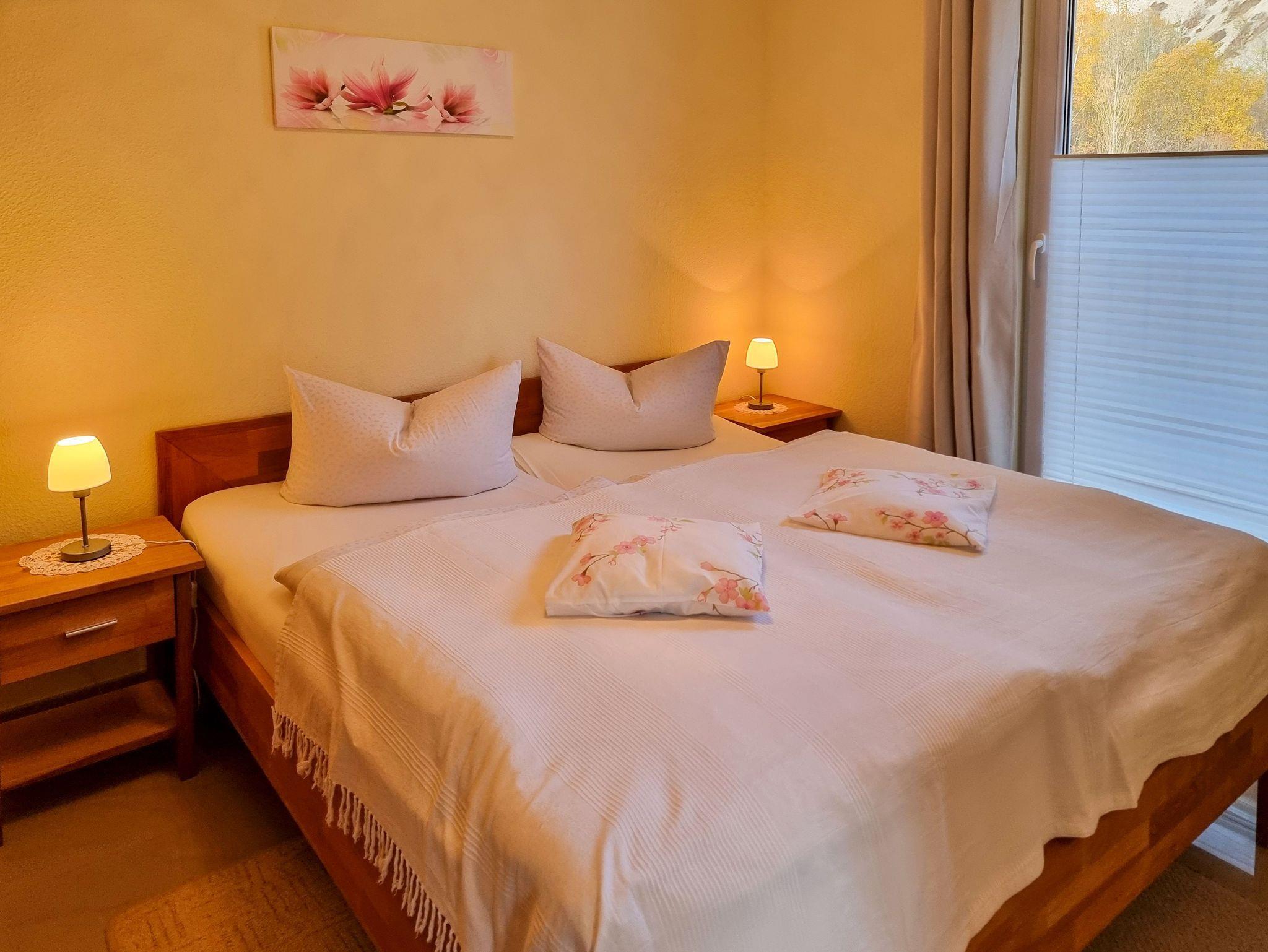 ? Das Schlafzimmer ist mit einem Doppelbett, Nachtschränkchen, Leselampe und Kleiderschrank ausgestattet.