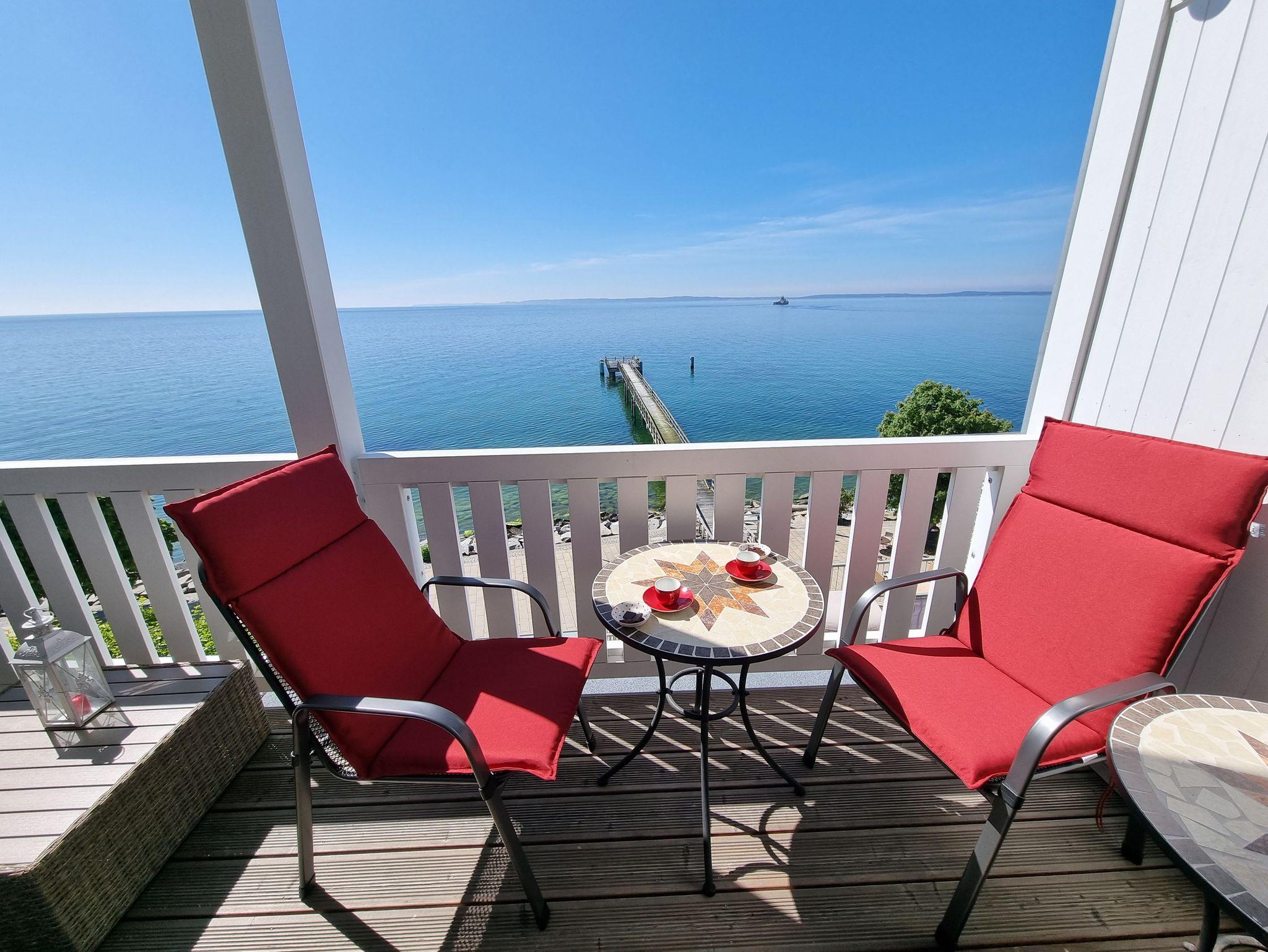 ? In der komfortablen Ferienwohnung „mer veille“ haben Sie einen traumhaften Seeblick vom Südbalkon (8,6m²) auf die Ostsee, Fährschiffe und Fischerboote und schauen bis hin zu den Ostseebädern Binz, Sellin und Göhren. Richtung Westen geht der Blick über die Strandpromenade und den Stadthafen bis zum Fährhafen Mukran. Der große Balkon ist überdacht und bietet eine Bistro-Sitzgruppe, einen Esstisch, 2 Terrassenstühle (Hochlehner mit Polsterauflagen). Die Möbel bleiben auch im Winter auf dem Balkon. Auf der Sonneninsel Rügen können Sie den Balkon für Stunden auch im Winter sonnig und windgeschützt genießen.