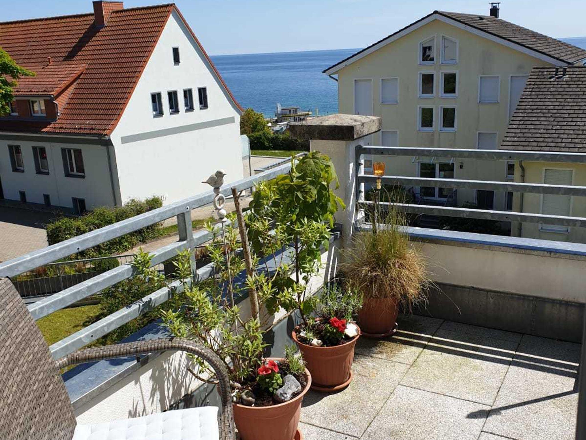 Die Ferienwohnung Sonnendeck verfügt über ein Schlafzimmer mit Doppelbett (1,80 m x 2,00 m), ein Bad / WC, einen großen hellen Wohn - Essbereich, einen möblierten Balkon mit Meerblick und ein Bad mit Badewanne/WC.