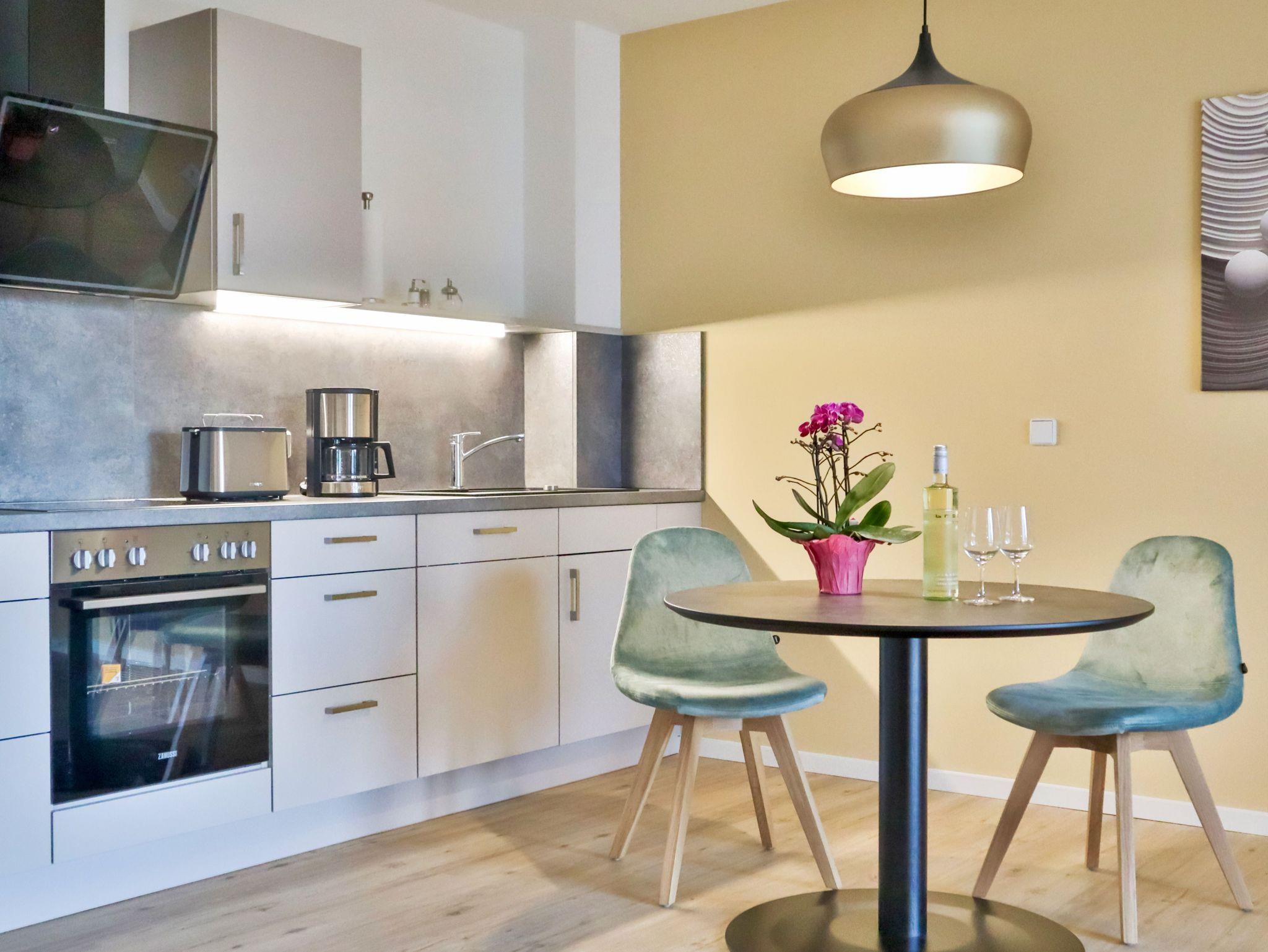 Darüber hinaus gibt es einen Wohnraum mit Küche, Loungebereich und Esstisch sowie einen Süd-Balkon bzw. Terrasse direkt vor Wohn- und Schlafzimmer. Gerne stellen wir Ihnen ein Kinderbett und einen Hochstuhl zur Verfügung.