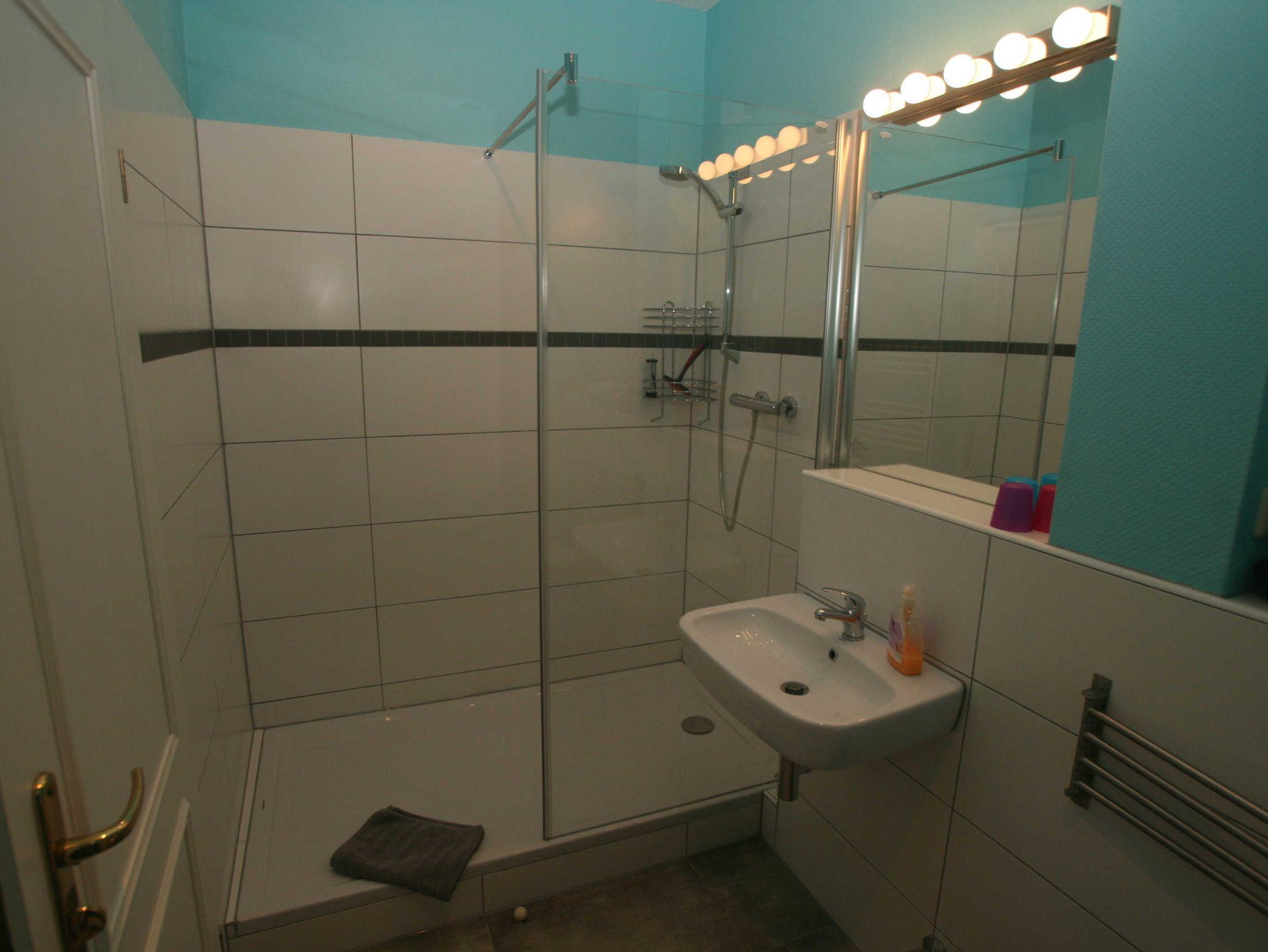 Ausserdem gibt es ein geräumiges Schlafzimmer mit einem Doppelbett (1,80x2,00m) , zwei Nachtschränkchen, einen grossen Kleiderschrank und ein Frisiertischen. Ein Bad mit Dusche ist vorhanden. Fön, Handseife und Toilettenpapier stellen wir für Sie bereit. Bettwäsche und Handtücher sind im Preis schon enthalten.