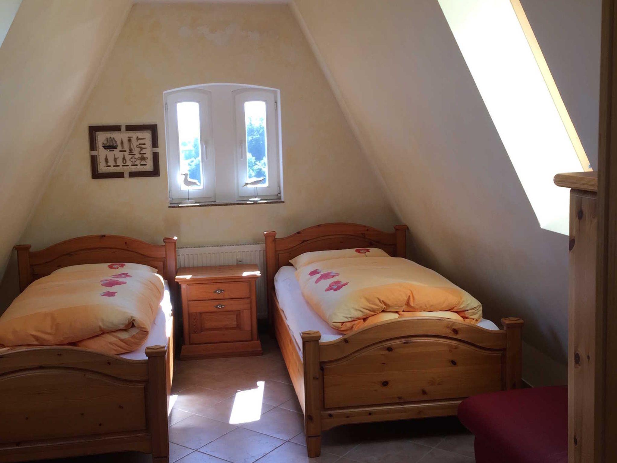 Die kleine Küche/Kitchenette ist mit dem üblichen Geschirr/Besteck etc. ausgestattet. Im Bad befindet sich eine Dusche, die auch als Dampfdusche genutzt werden kann mit zwei Holzsitzen, sowie eine Badewanne. Des Weiteren ist eine Waschmaschine vorhanden. Es gibt drei Schlafzimmer: Ein abschliessbares Zimmer mit zwei Einzelbetten, sowie im oberen offenen Maissonettebereich ein Doppelbett, daneben eine kleine abschliessbare Kammer mit einem Einzelbett. Bettwäsche und Handtücher werden bereitgestellt. Hierfür werden bei Buchung automatisch pro Aufenthalt und Person einmalig 25,00 € berechnet.