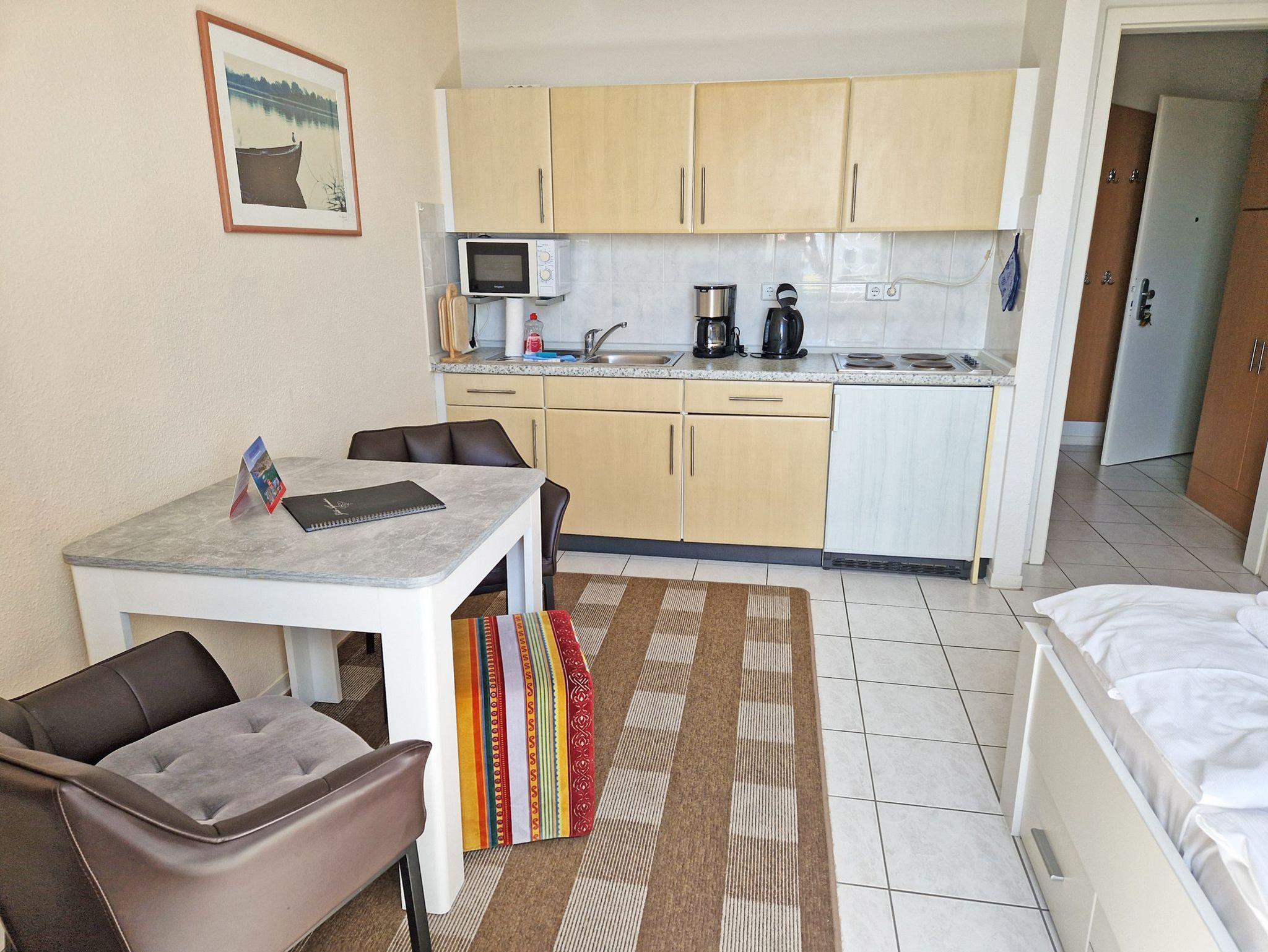 ? Einbauküche mit 4-Plattenherd, Mikrowelle, Kühlschrank, Kaffeemaschine und Wasserkocher.