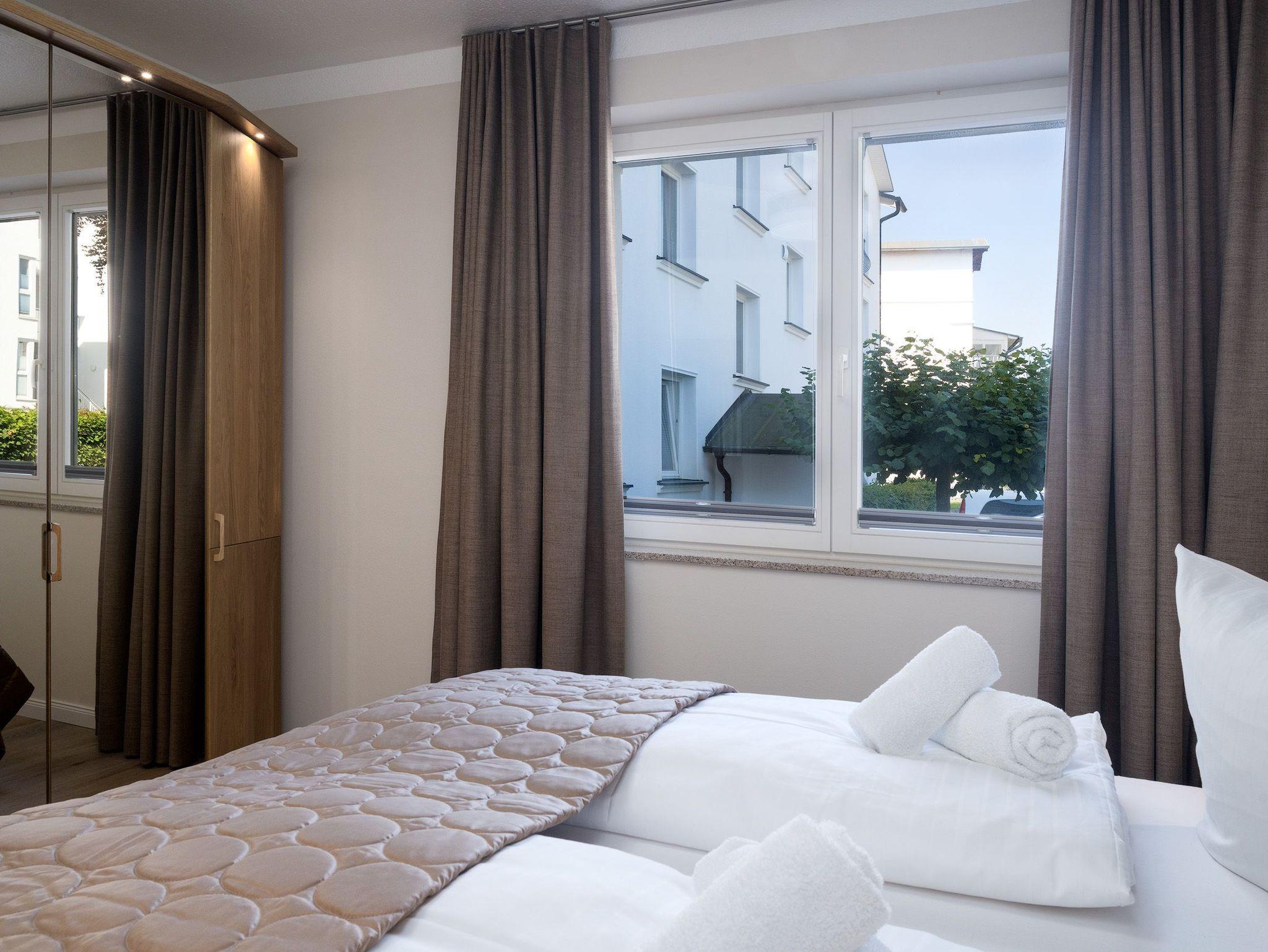 • 2-Raum-Wohnung in Hochparterre mit einem Schlafzimmer mit großen Doppelbett, je ein Nachtschränkchen mit Leselampe, großzügigen Kleiderschrank mit Safe.