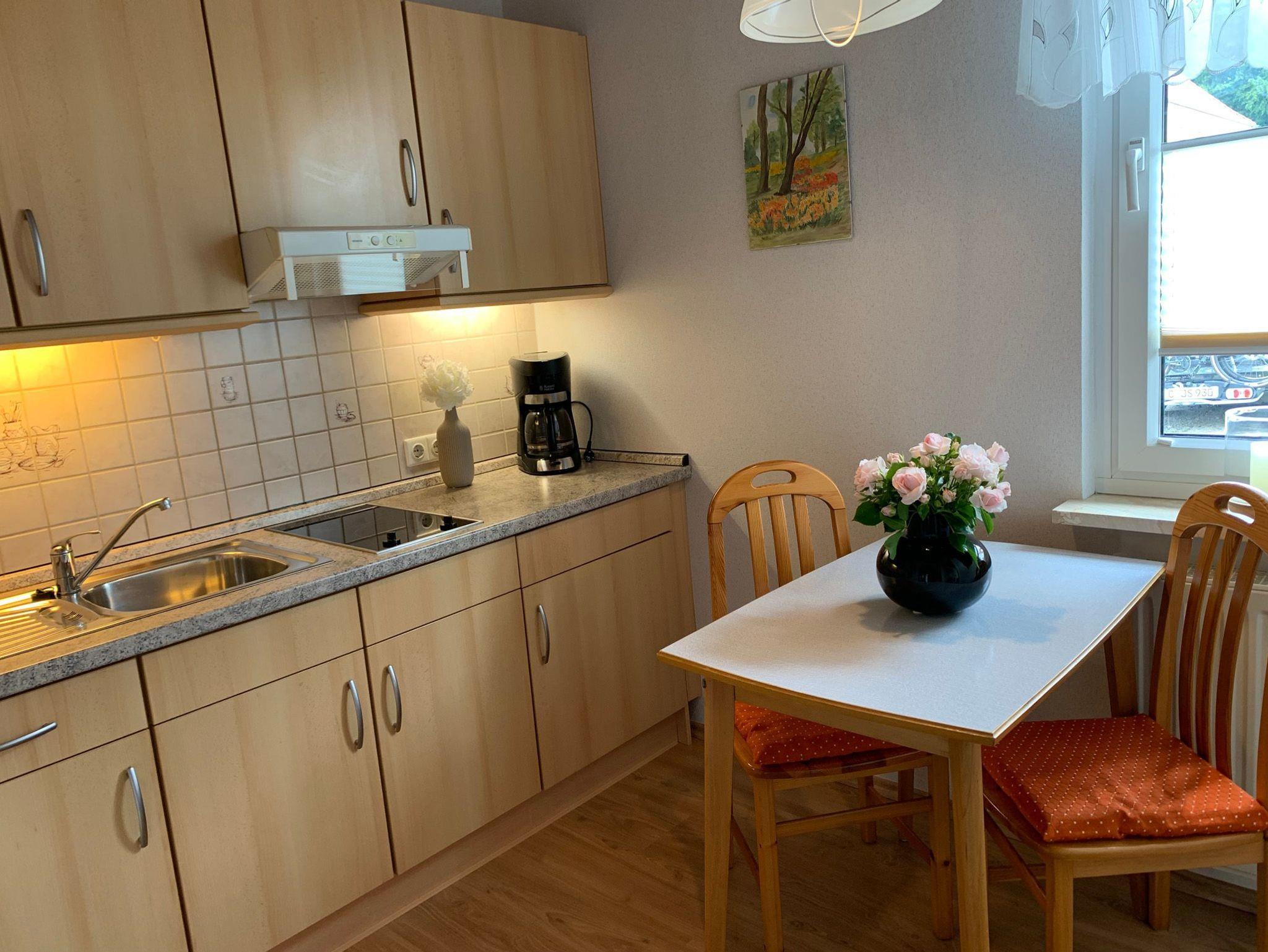 ? offene, gut ausgestattete Küche mit Sitzgelegenheit