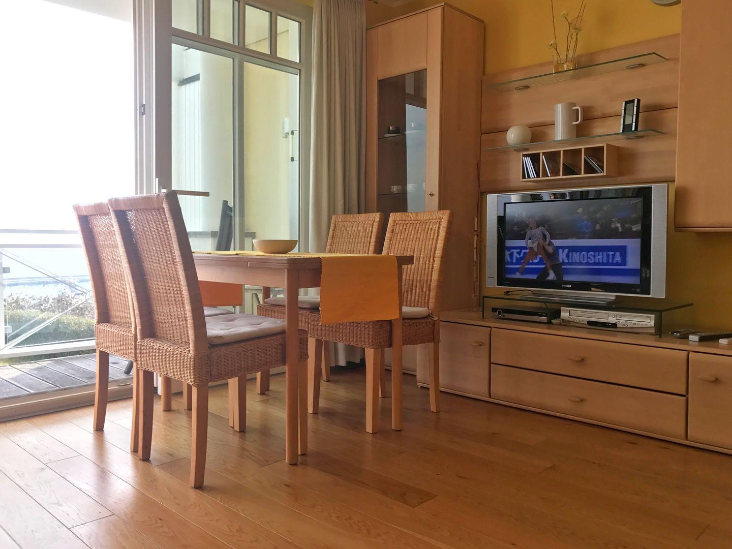 Die 2-Zimmer-Ferienwohnung befindet sich im Erdgeschoss des Appartementhauses "Prinz Heinrich" und gliedert sich in einen Wohnbereich mit tollem Panorama-Meerblick, ein gemütliches Schlafzimmer sowie eine Badezimmer. Vom Wohn- und Essbereich des hellen Appartements, der über eine offene und komplett ausgestattete Küchenzeile verfügt, können Sie über große, bodentiefe Fenster einen traumhaften Blick auf die Ostsee und den Stadhafen Sassnitz genießen. Die bodentiefen Fenster lassen sich großflächig öffnen und ermöglichen den Zutritt zu der nach Süden ausgerichteten, überdachten Terrasse und dem kleinen, der Wohnung zugehörigen, Gartenanteil mit eigenem Strandkorb. Maximal kann dieses tolle Appartement 4 Personen beherbergen, wobei das Schlafzimmer mit großem Doppelbett und Flachbildfernseher über Schlafmöglichkeiten für 2 Personen verfügt und die gemütliche Schlafcouch im Wohnbereich zwei weiteren Personen Schlafplätze bietet. Das Tageslichtbadezimmer des komfortablen Appartements ist mit einer ebenerdigen Glasdusche, Waschbecken und natürliche einem WC ausgestattet. Die Wohnung verfügt über einen eigenen Stellplatz am Haus. Fahrradunterstellmöglichkeit vorhanden.