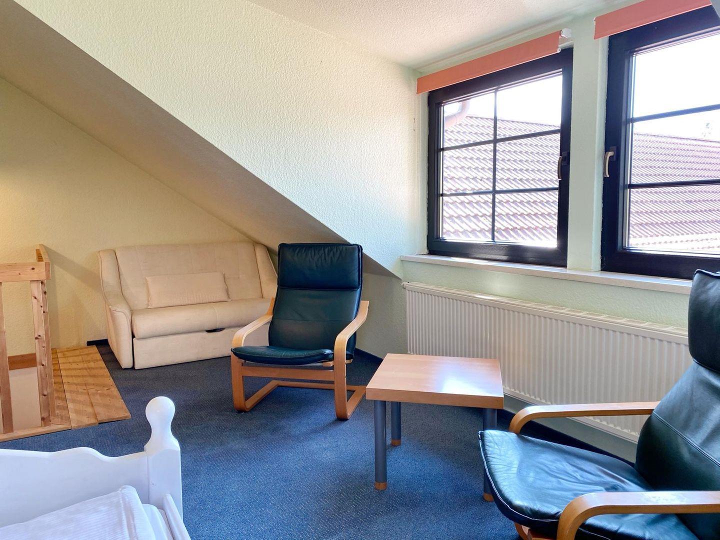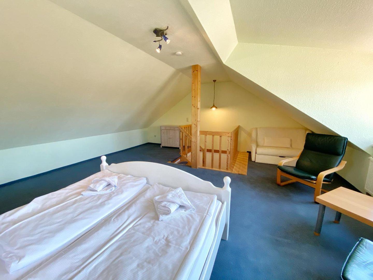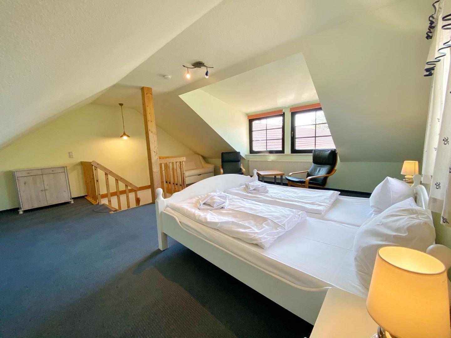 In einem kleinen hellen Flur befindet sich ein grosser Schrank mit vielen Fächern für Ihre mitgebrachten persönlichen Dinge. Sie gehen von hier über die Holztreppe in das Obergeschoß und befinden sich im behaglichen Schlafraum mit einem bequemen Doppelbett und der ausklappbaren Doppelbettcouch. Durch die Dachschrägen erleben Sie ein besonders schönes Wohngefühl!