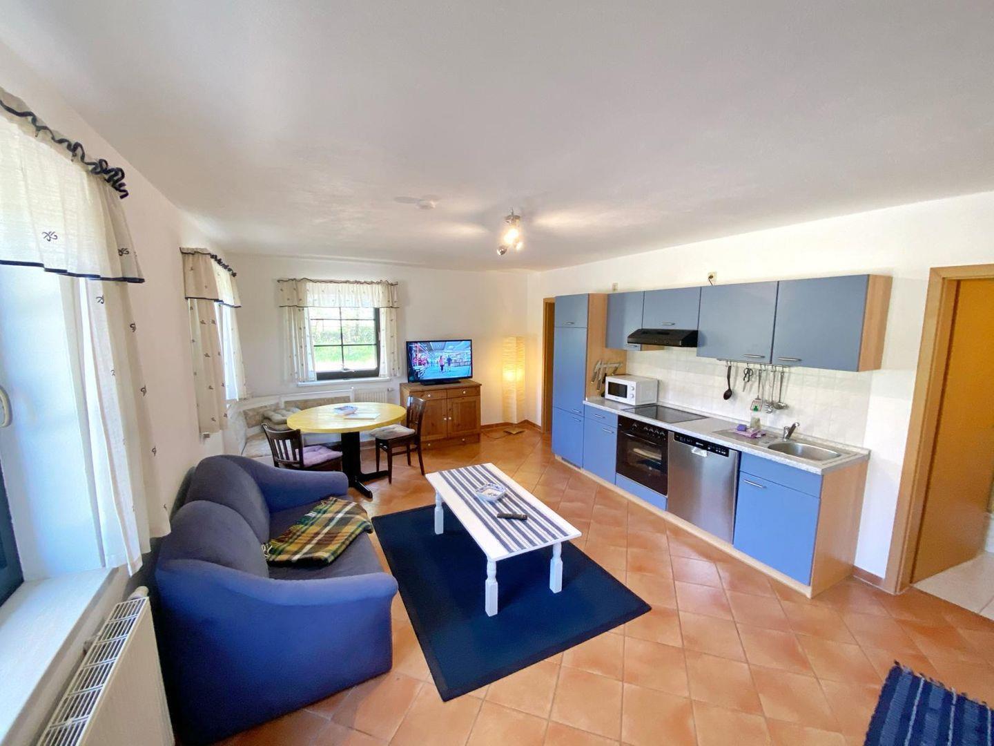 Die Maisonettewohnung ist ca. 60 m² groß und für bis zu vier Personen geeignet. Nach dem Betreten befinden Sie sich im Wohn-Essbereich. Zur Ausstattung gehören hier eine komplett eingerichtete Küchenzeile mit Kühlschrank und Gefrierfach, Ceran-Kochfeld, Backofen, Geschirrspülmaschine, Kaffeemaschine, Wasserkocher und Toaster.