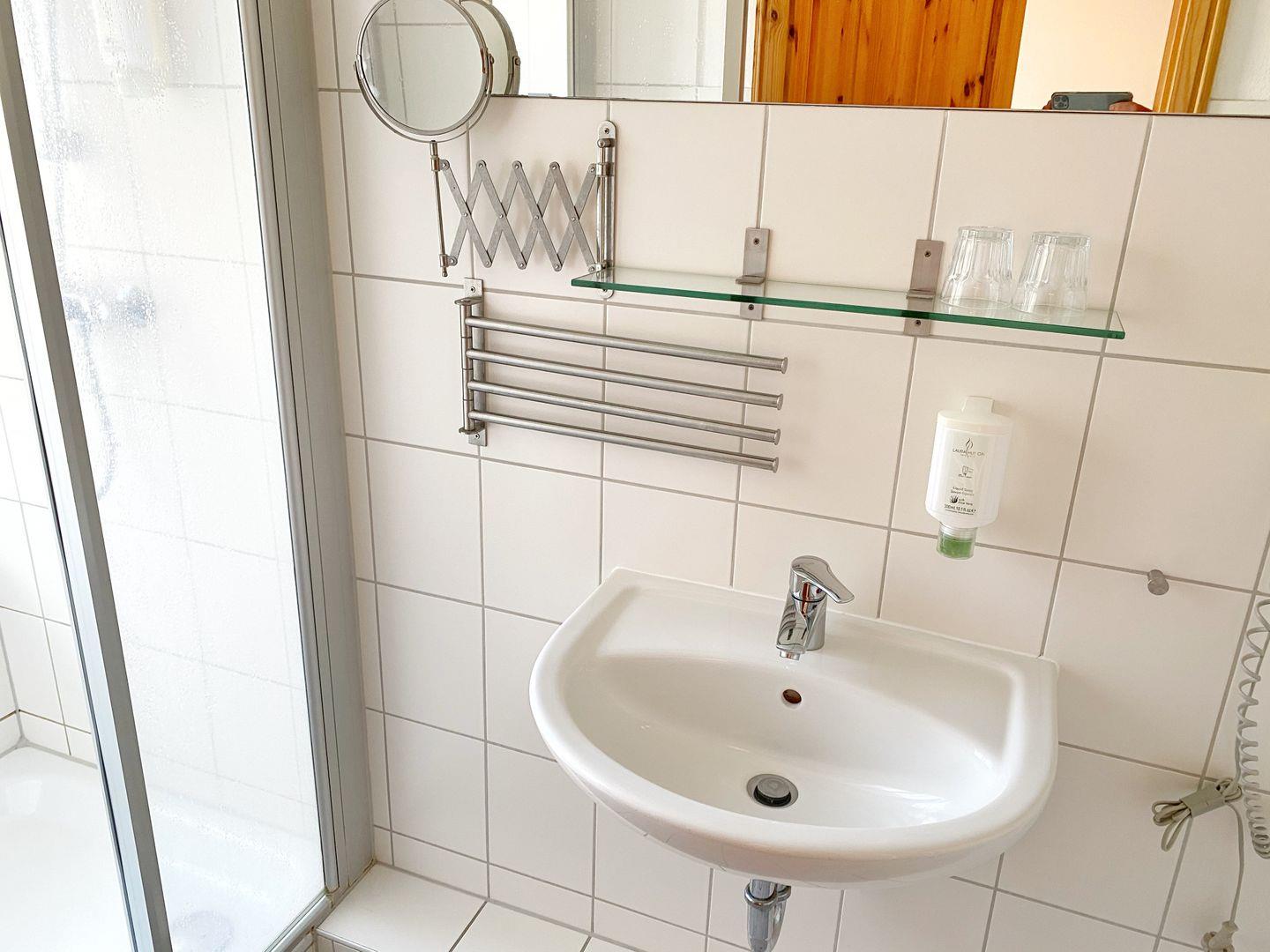 Raumaufteilung: Wohnraum, Schlafzimmer, Pantry Küche, Bad mit Dusche und Fön.