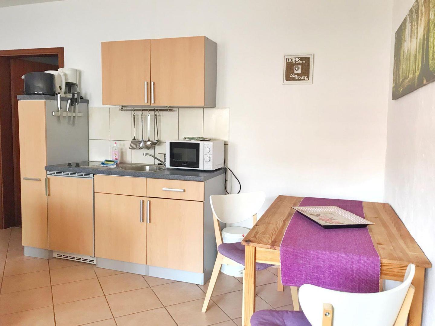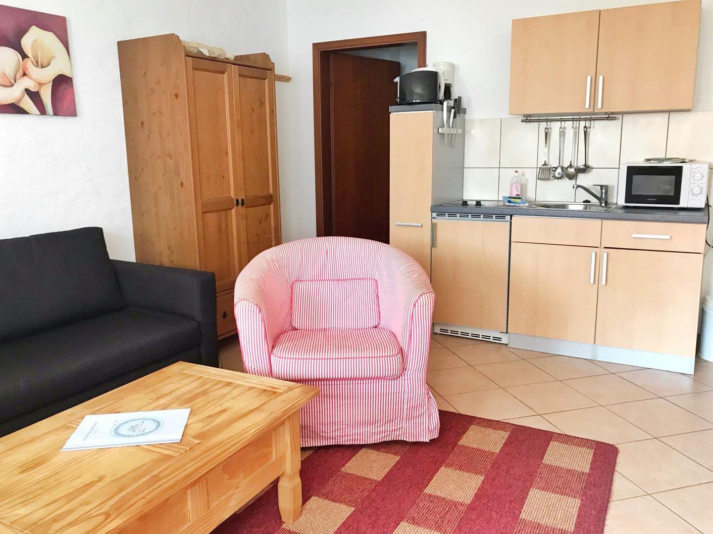 Im Wohn-Essraum finden Sie die Sitzecke und die Miniküche mit dem Esstisch vor. Ein Flachbild -TV steht für gemütliche Fernsehabende für Sie bereit. Zur Küche gehören ein Zweiplattenherd, eine Kaffeemaschine, ein Toaster und ein Wasserkocher, sowie ein Kühlschrank.