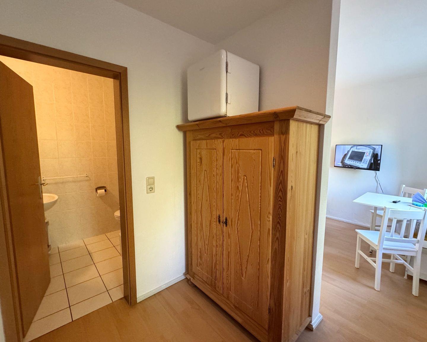 Das Doppelzimmer einfachen Standards befindet sich straßenseitig im Erdgeschoss und ist etwa ca. 25 m² groß. Es gliedert sich in einen kleinen Flur mit Kleiderschrank, ein Badezimmer mit Dusche und WC und einen Schlafraum mit 2 einem Doppelbett, einem Esstisch mit 2 Stühlen, einem kleinen Kühlschrank und einem Flachbildfernseher. Das Zimmer hat einen kostenfreien Internetzugang und einen PKW-Stellplatz.