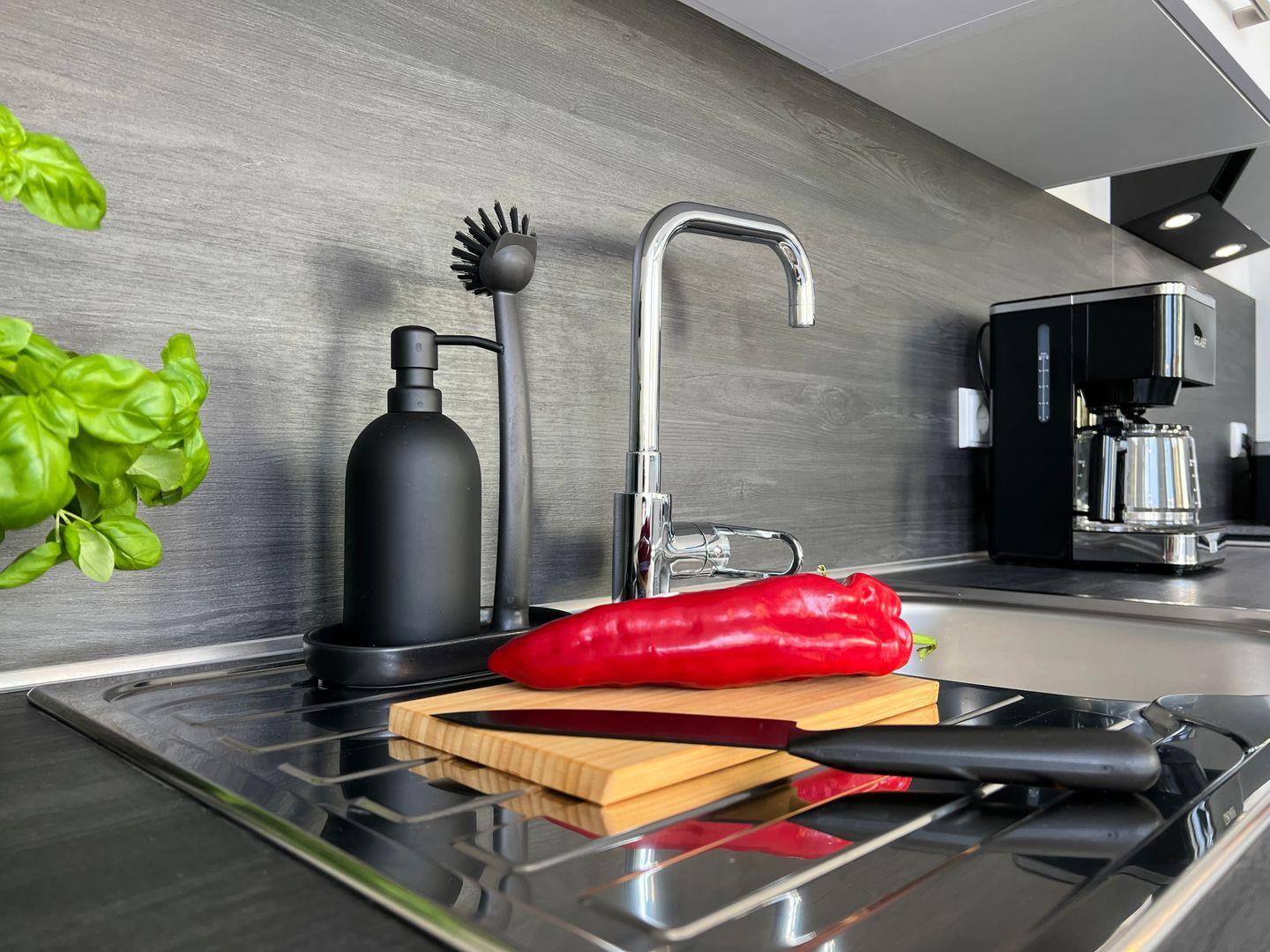 In der hochwertigen offenen Küche findest du neben einem Kochfeld mit vier Kochplatten einen Backofen sowie einen Kühlschrank mit Gefrierfach und einen Geschirrspüler. Die sorgfältig ausgewählten Küchenutensilien helfen dir beim Kochen und Genießen. Zu unserer Grundausstattung gehören außerdem Salz, Pfeffer und Zucker. Weiterhin stehen dir für dein Frühstück ein Toaster sowie für die Kaffee- und Teezubereitung eine Kaffeemaschine und ein Wasserkocher zur Verfügung.