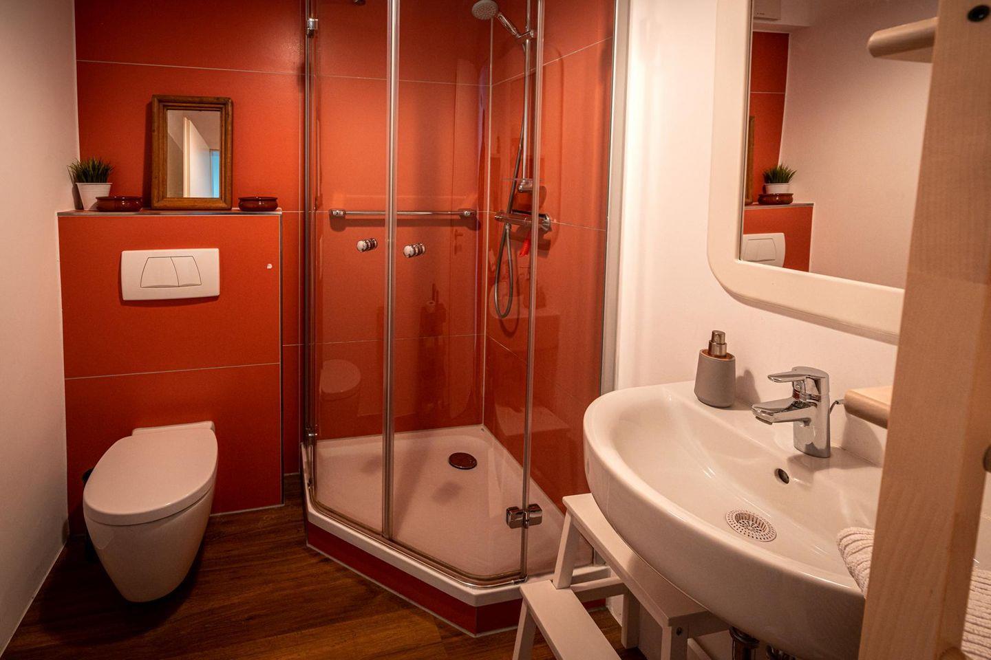 Das Wohn-Esszimmer ist mit einer gemütlichen Couch und großem Flachbild-TV sowie einem Esstisch mit 4 Stühlen ausgestattet; die integrierte Küchenzeile verfügt über eine Spülmaschine, Induktionsherd, Backofen und weitere Selbstverständlichkeiten. Dem Wohn-Esszimmer vorgelagert ist ein heller Wintergarten mit gemütlichem Sessel und kleinem Essplatz. Ein Balkon gehört auch zur Wohnung und ist ebenfalls vom Wohn-Essbereich aus begehbar.