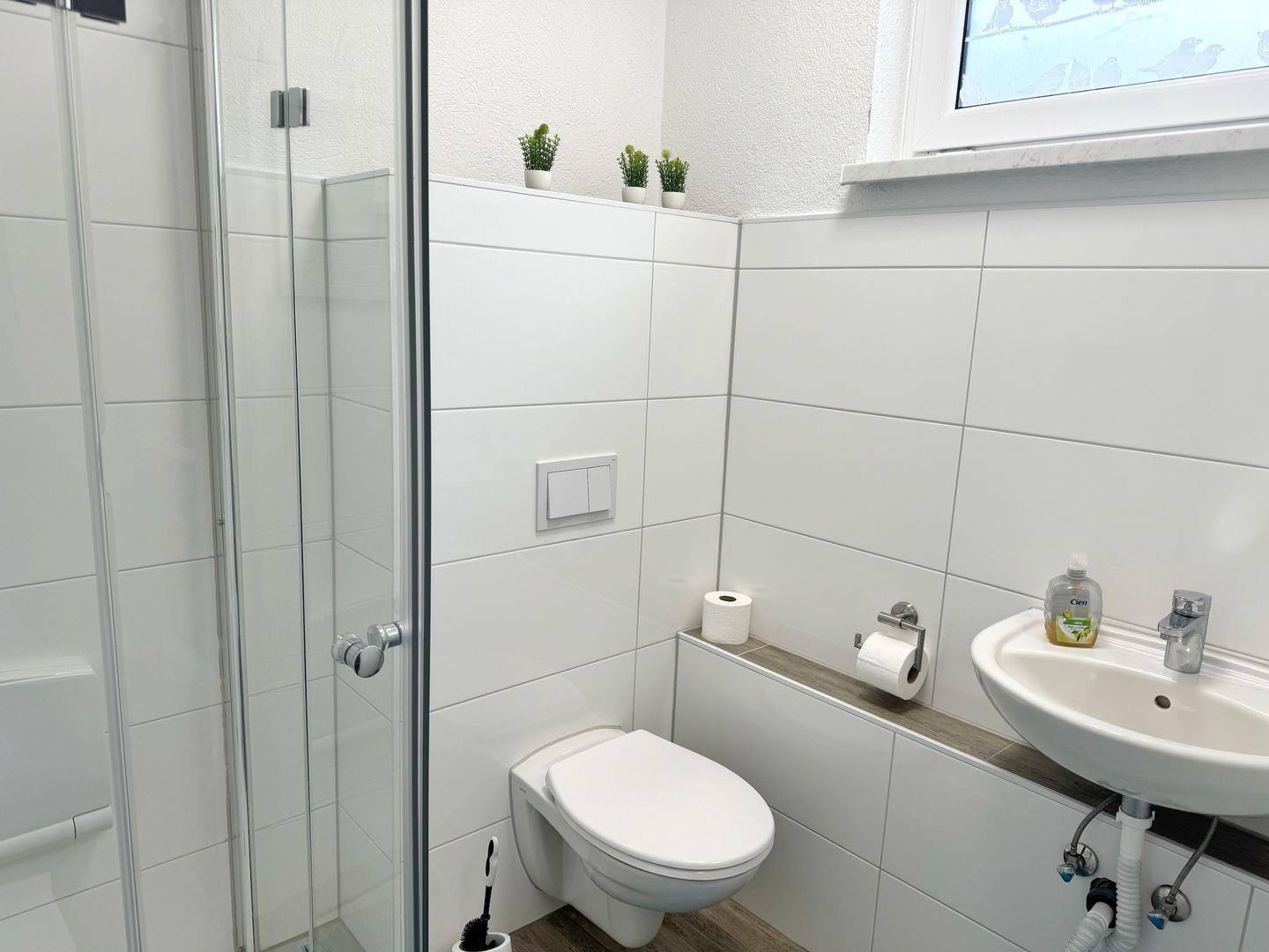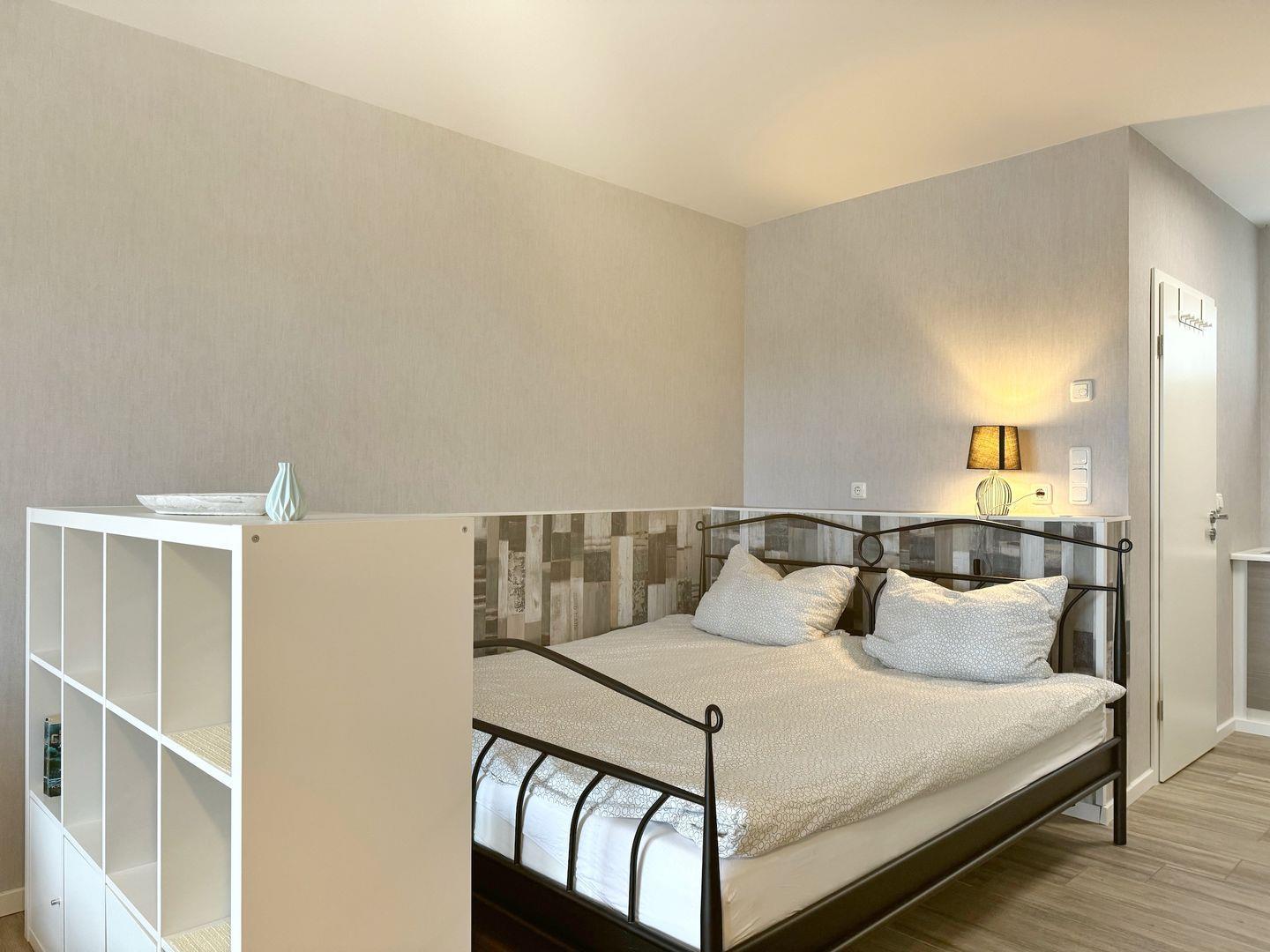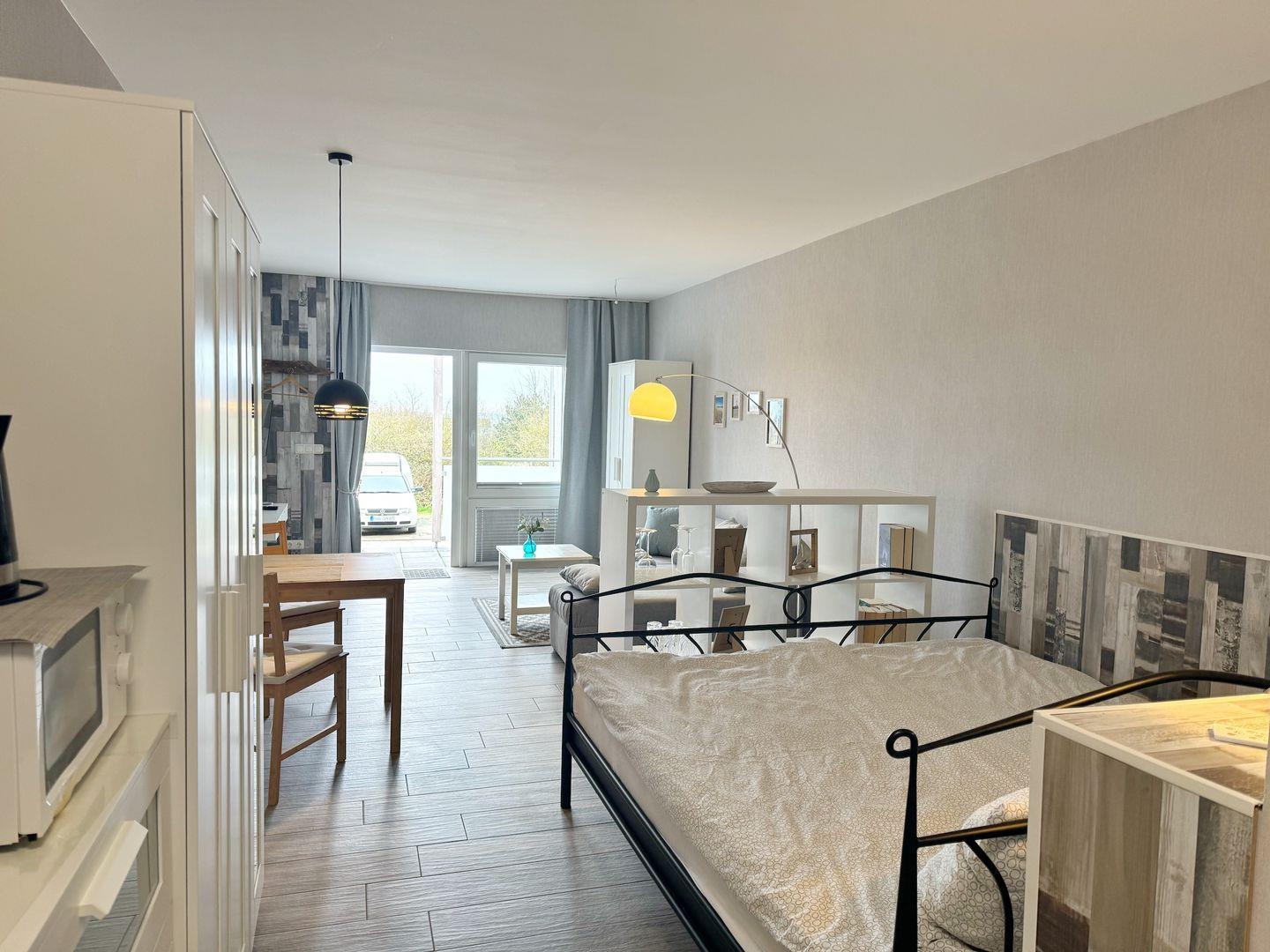 Die modern eingerichtete 1-Zimmer Ferienwohnung befindet sich im Erdgeschoß eines Einfamilienhauses. Der Raum ist unterteilt in den gemütlichen Wohnbereich mit Flachbild-TV und einem Esstisch, den Schlafbereich, der durch einen Raumteiler vom Wohnbereich abgetrennt ist, und im hinteren Bereich die Küche. Es gibt ein modernes Bad mit ebenerdiger Dusche. Zur Wohnung gehört eine Terrasse mit Gartenmöbeln und natürlich ein PKW-Stellplatz auf öffentlichem Gelände gegenüber vom Haus.