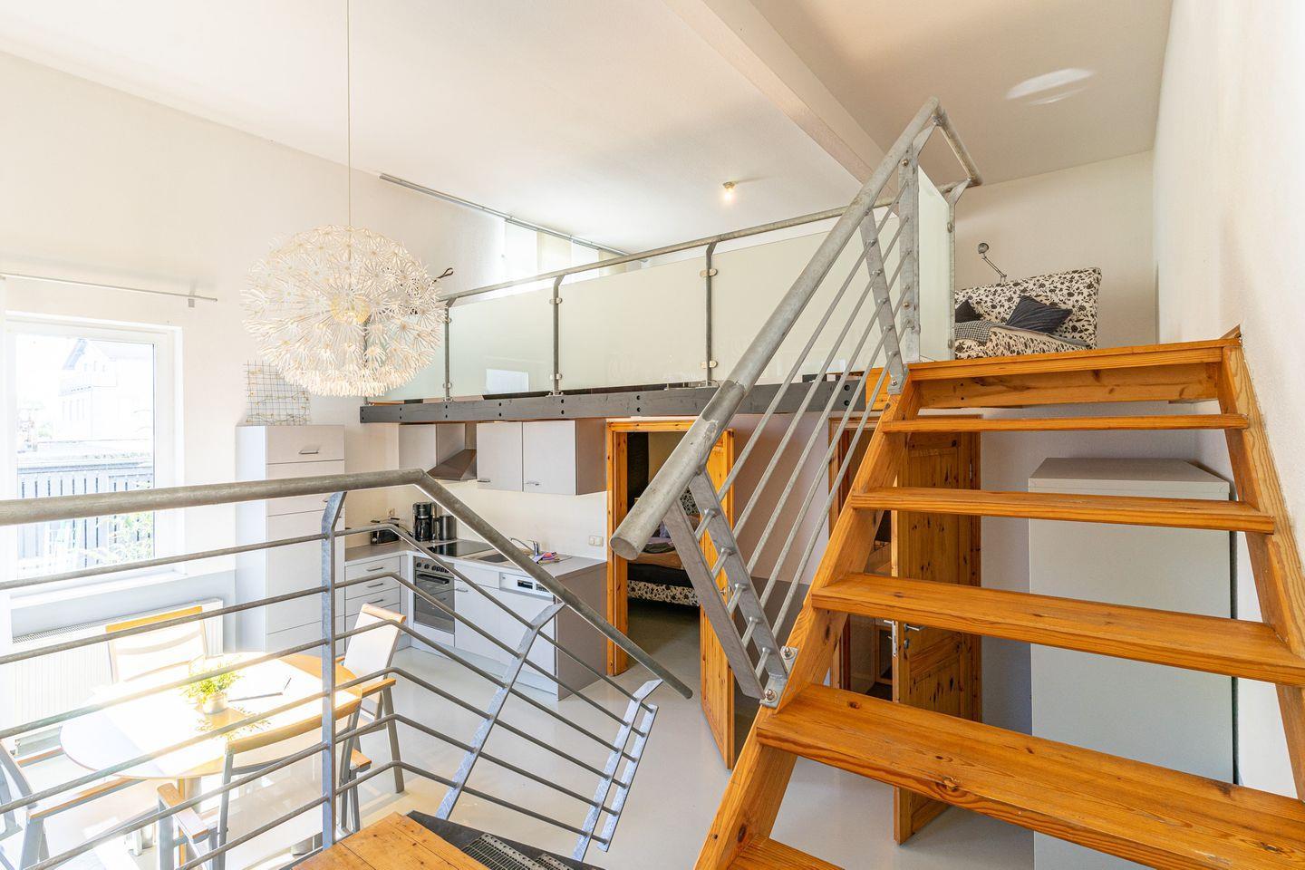 Über eine Treppe gelangt man in das Wohnzimmer auf der Galerie.