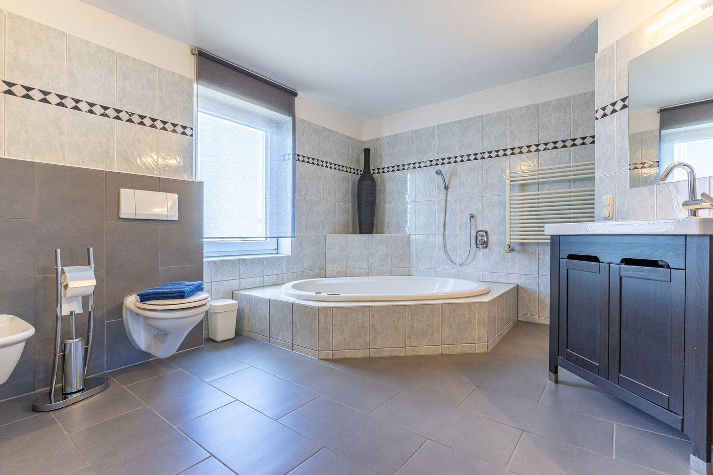 Das geräumige Badezimmer mit Tageslicht verfügt über eine ebenerdige, offene Dusche, über eine große Eckbadewanne mit Whirlpool sowie über ein WC, Urinal, Bidet und einen Waschtisch.