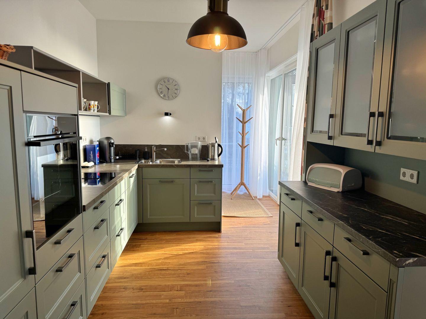 Die Küche ist separat. Die moderne Einbauküche ist komplett ausgestattet mit Geschirrspüler, Induktionsherd, Hoch-Backofen, Kühlschrank mit Gefriermöglichkeit und weiteren Selbstverständlichkeiten wie Kaffeemaschine, Wasserkocher und Toaster. Außerdem steht eine Kaffee-Kapselmaschine (Nespresso) zur Verfügung.