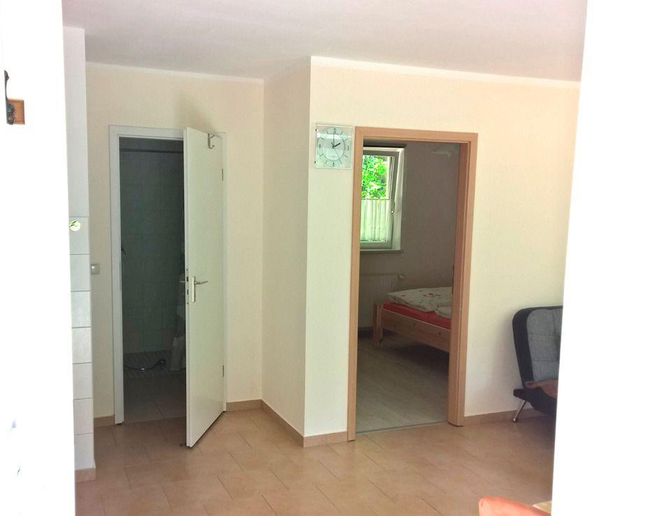 Sie betreten diese Doppelhaushälfte im Wohnbereich, der mit einer Anrichte, einem TV-Gerät, einer Schlafcouch und einem Couchtisch ausgestattet ist. Die Kochnische hat zwei Elektroherdplatten, einen Kühlschrank mit Tiefkühlfach, eine Mikrowelle, Kaffeemaschine, Toaster, Wasserkocher und einen Tisch mit zwei Stühlen. Das Schlafzimmer ist mit einem Doppelbett und einem Kleiderschrank eingerichtet. Im Bad ist eine Dusche und ein WC. Weiterhin steht Ihnen eine Terrasse mit Gartenmöbeln und Holzkohlegrill sowie ein PKW Stellplatz zur Verfügung. Ein Spielplatz und ein Fußballplatz sind in der Nähe.