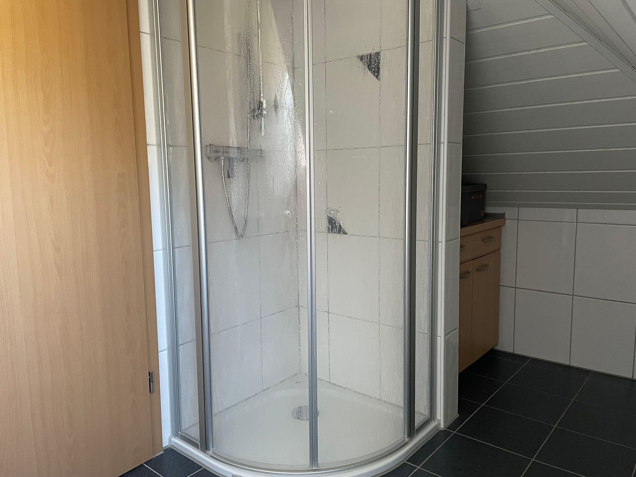 Das Bad ist modern und hell gefliest. Es verfügt über eine Dusche, Waschbecken und eine Toilette.