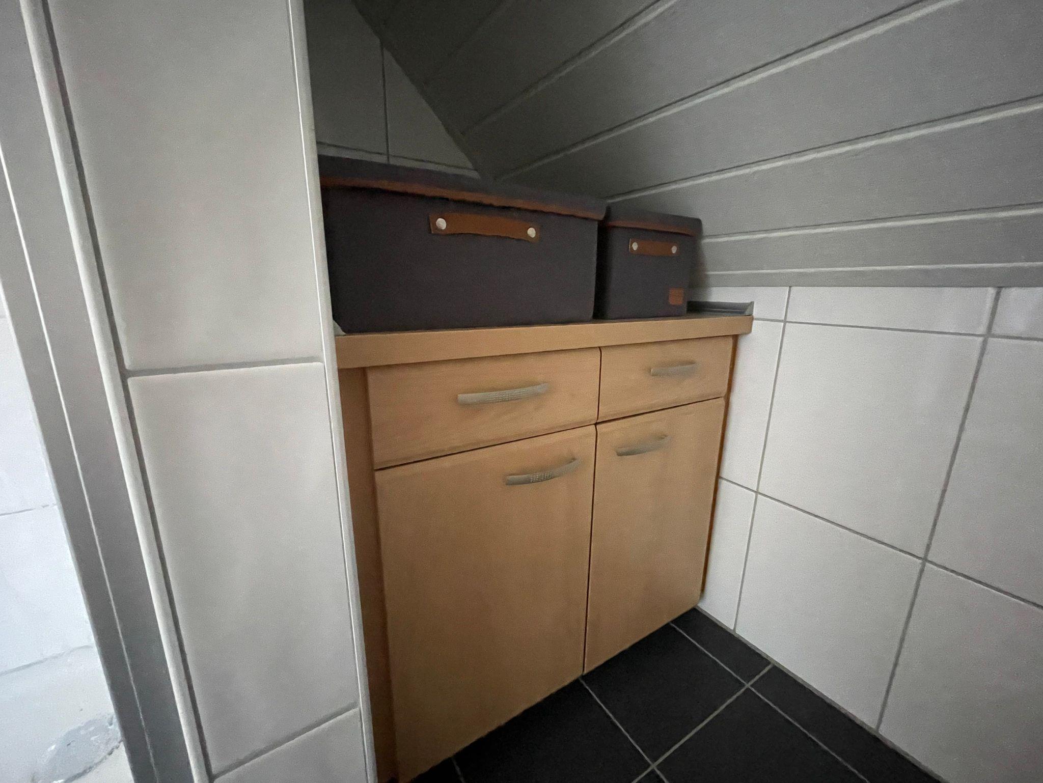 • Für Ihre Kleidung steht Ihnen ein Rollständer mit Kleiderbügel sowie ein zweiflügeliger Unterschrank mit zwei Schubladen zur Verfügung