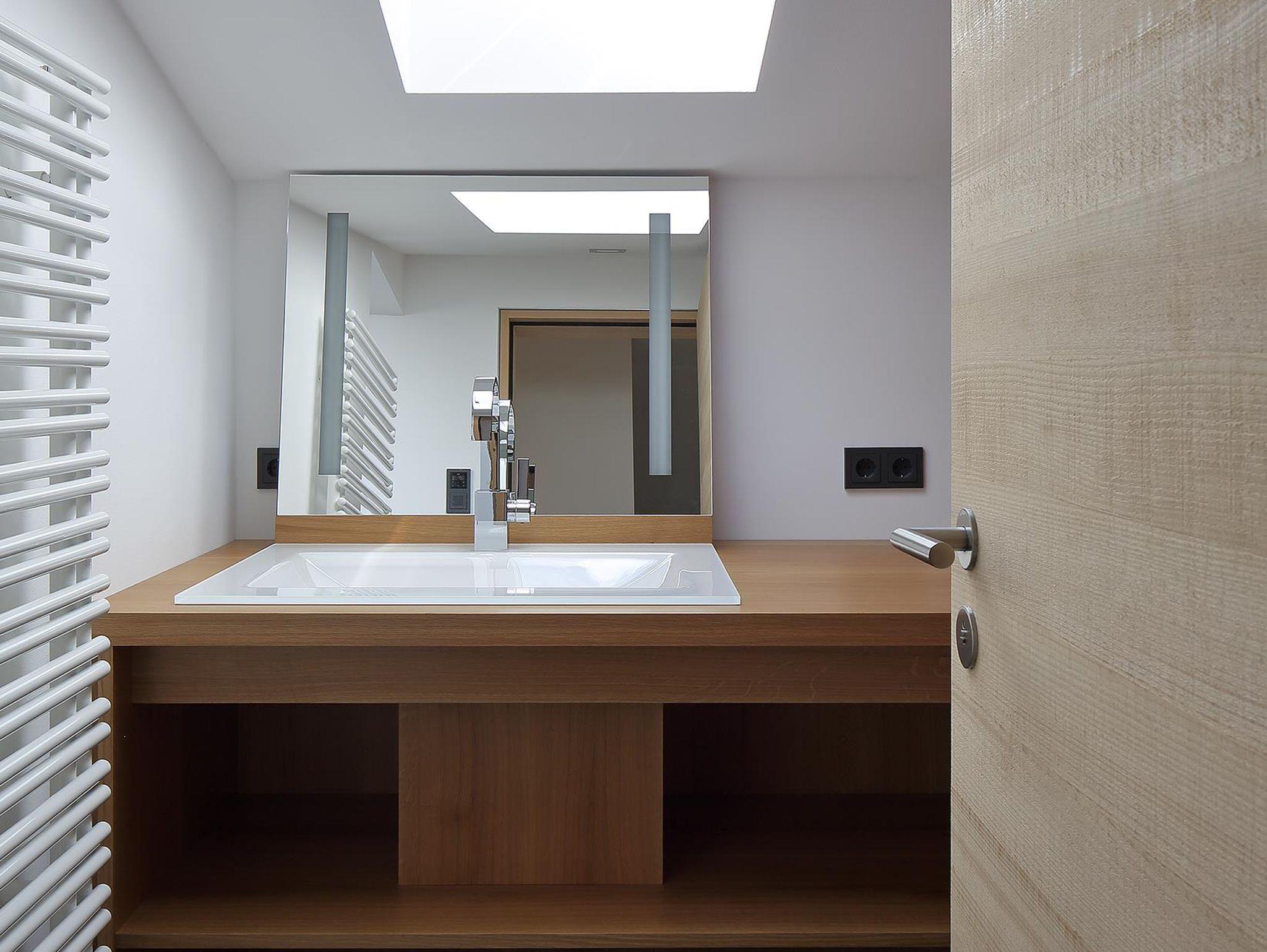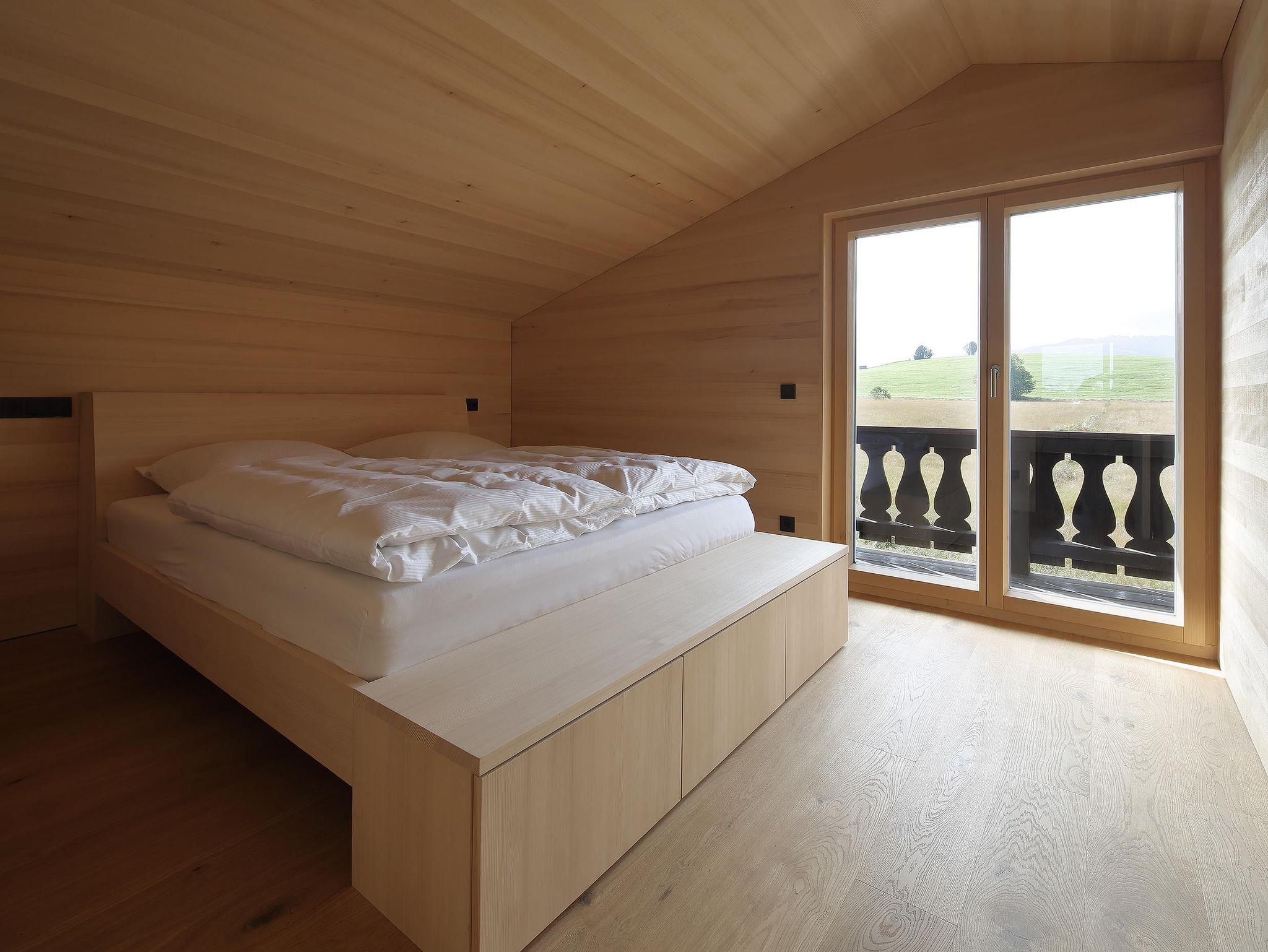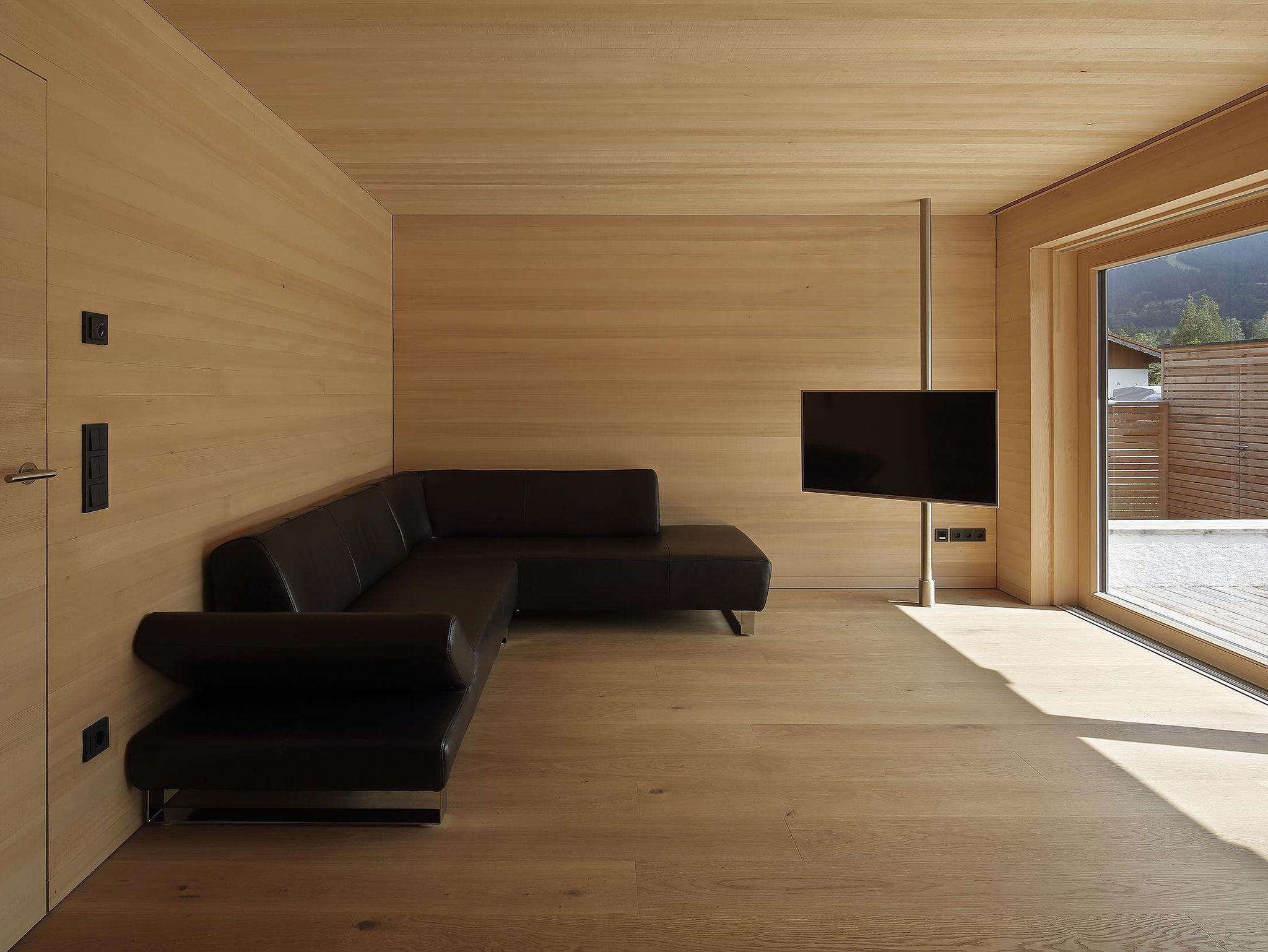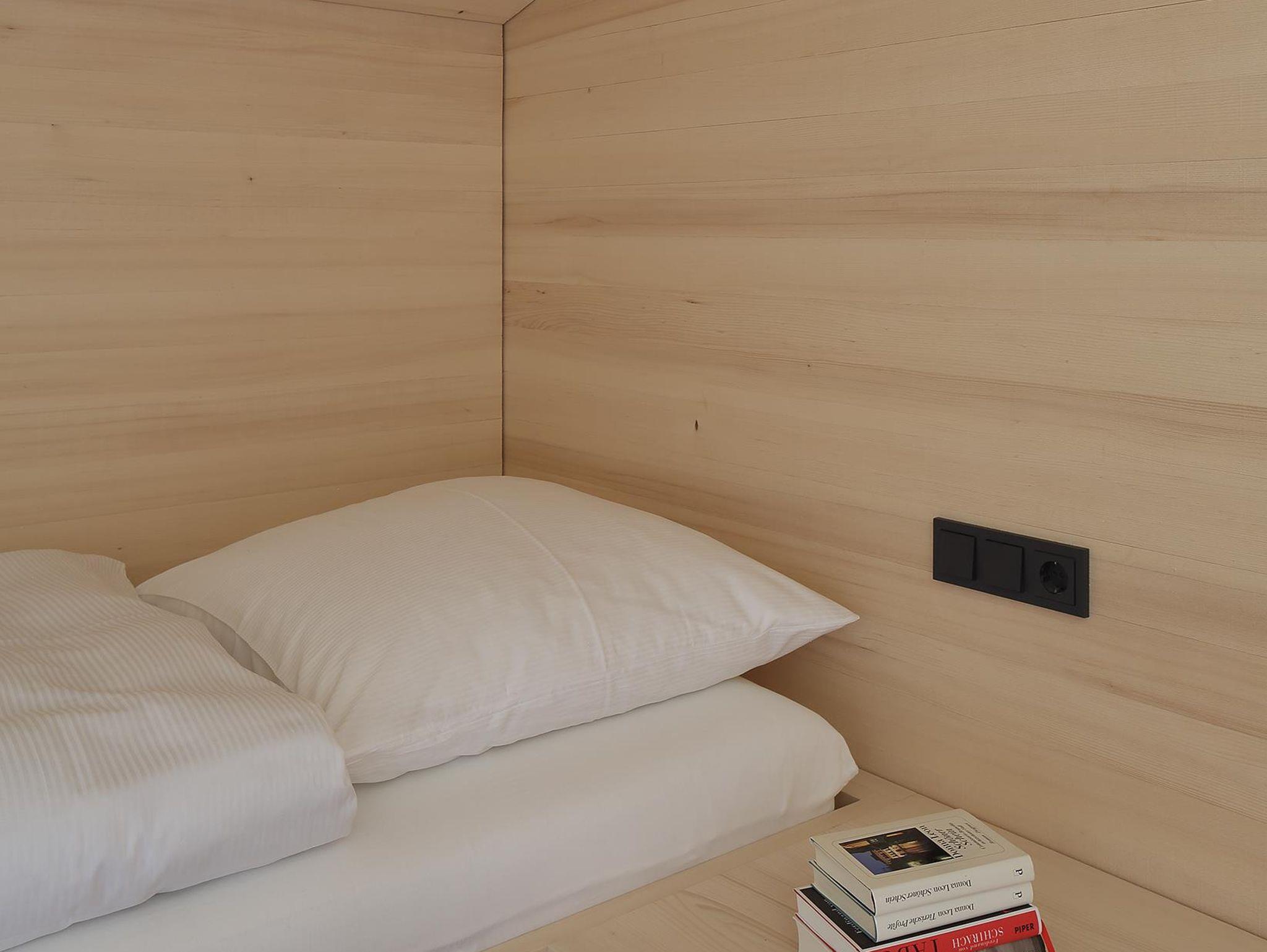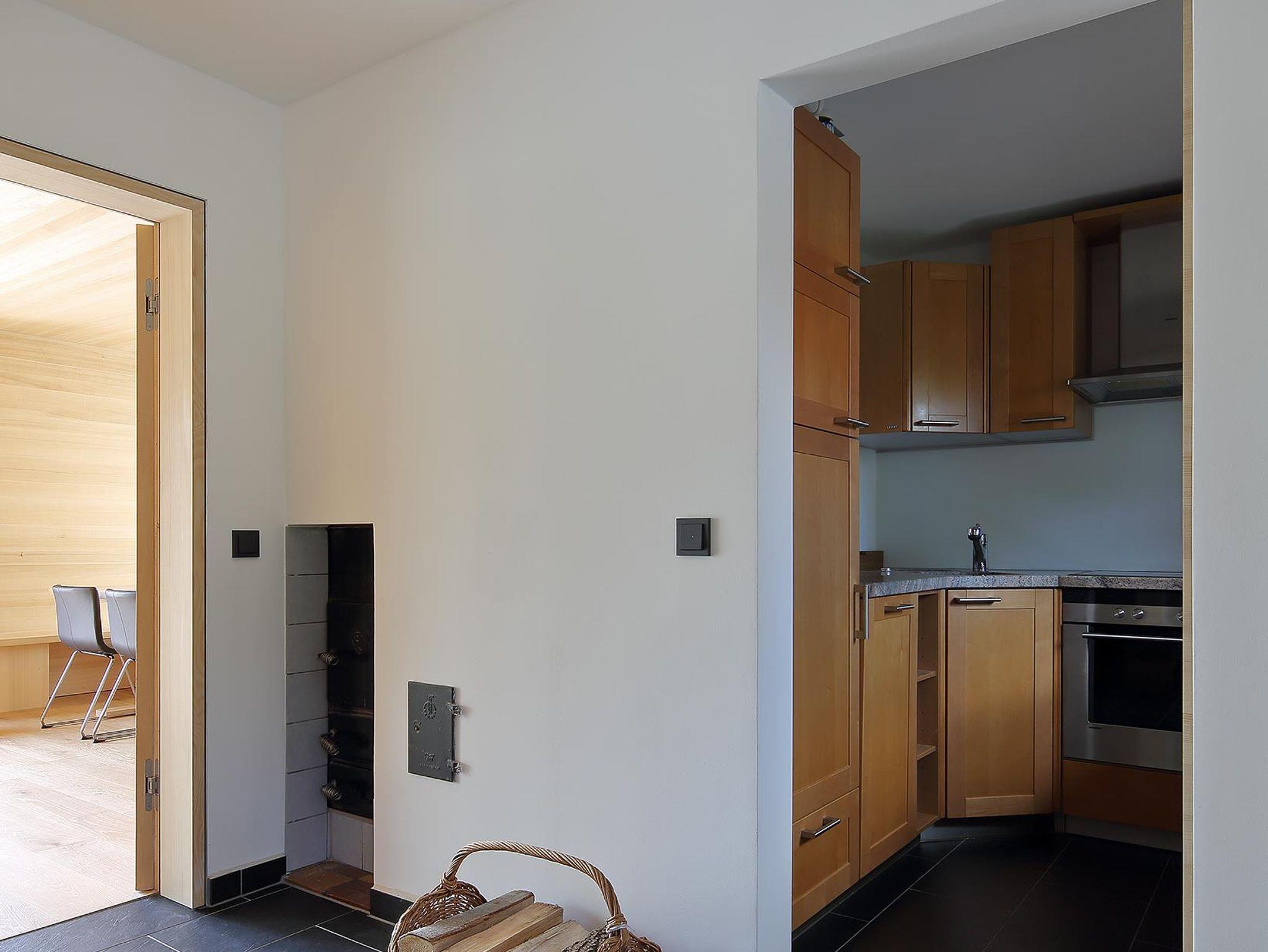 Bis auf den Kachelofen, der im Essbereich als Blickfang dient, erinnert im Ferienhaus holz[t]raum nichts mehr an den einstigen Bau aus den 1970er Jahren. Alle Wohnräume wurden komplett mit Weißtanne ausgekleidet, die Eichenböden stammen aus der Region. Unter ihnen verbirgt sich eine moderne Fußbodenheizung.