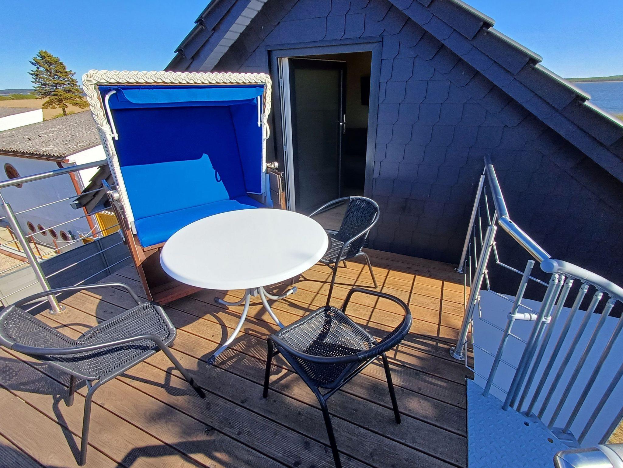 Die Ferienwohnung im Oberschoss ( Dachgeschoss mit Dachschrägen) mit sep. Eingang über eine Treppe von außen ist ausgestattet mit einer Schlafcouch für 2 Personen, separater Küchenzeile mit 2-Platten-Herd, Kühlschrank, Kaffeemaschine, Wasserkocher sowie Toaster. Das kleine Bad verfügt über DU/WC. Auf der ca. 9 qm großen möblierten Terrasse mit Strandkorb können Sie morgens Ihren Kaffee genießen oder den Abend bei einem Glas Wein ausklingen lassen.