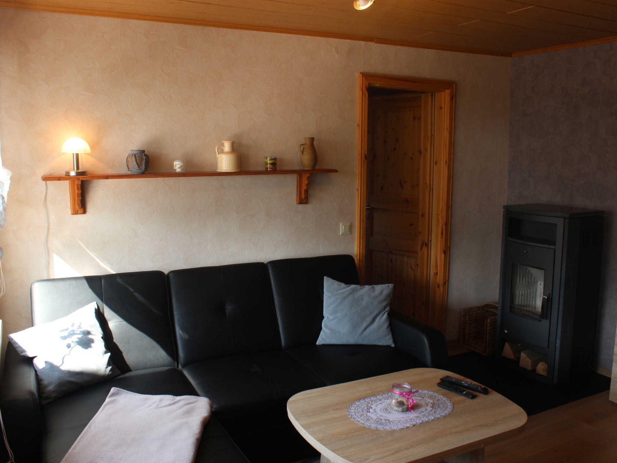 Das Wohnzimmer mit offener Küchenzeile ist mit einer Couch (3-Sitzer) und einem Couchtisch ausgestattet. Kommode sowie ein Fernseher und ein Radio sind ebenfalls vorhanden. Eine Garderobe komplettiert den Wohnbereich. Das Schlafzimmer sowie das Bad gehen vom Wohnzimmer aus ab.