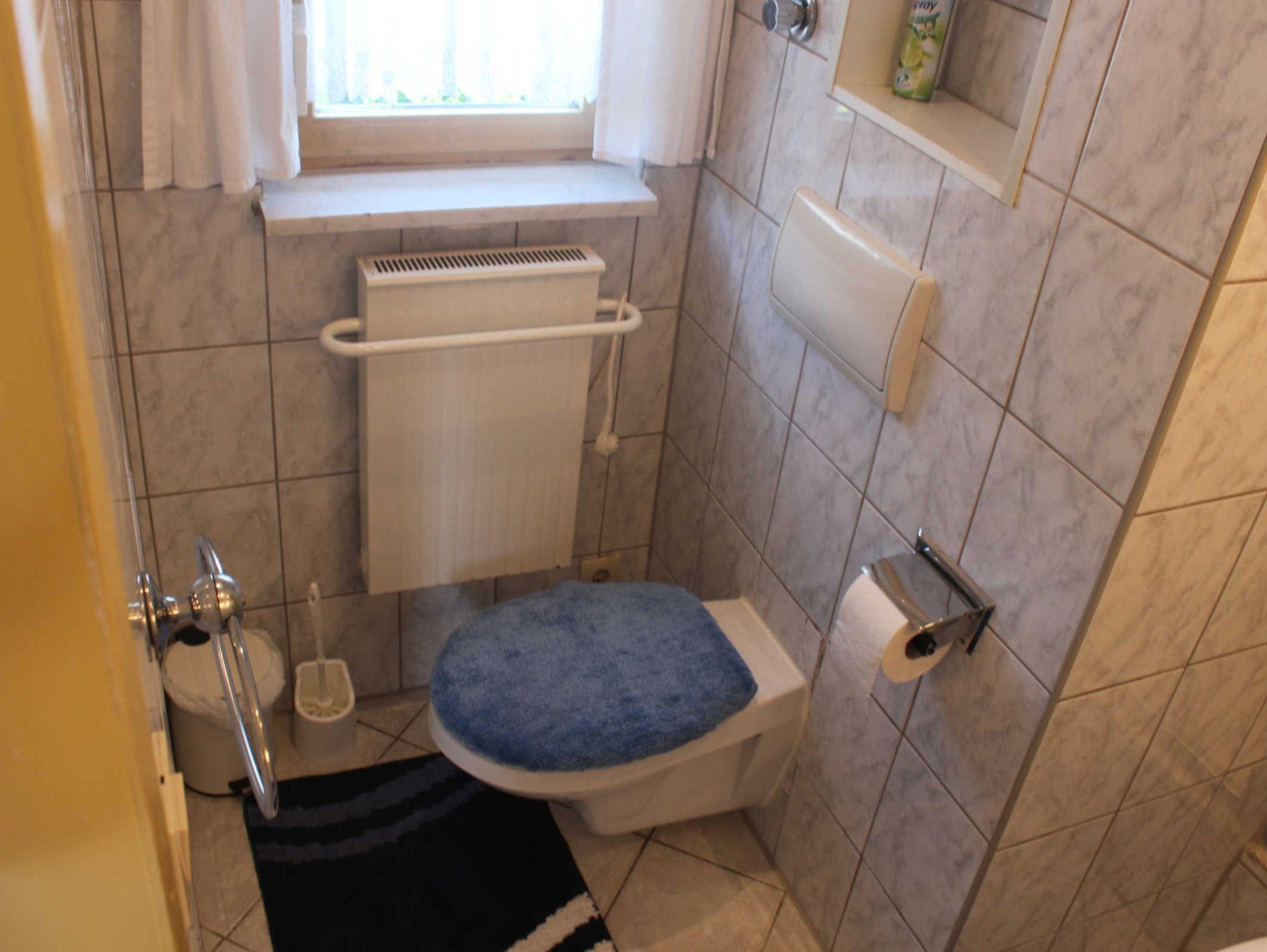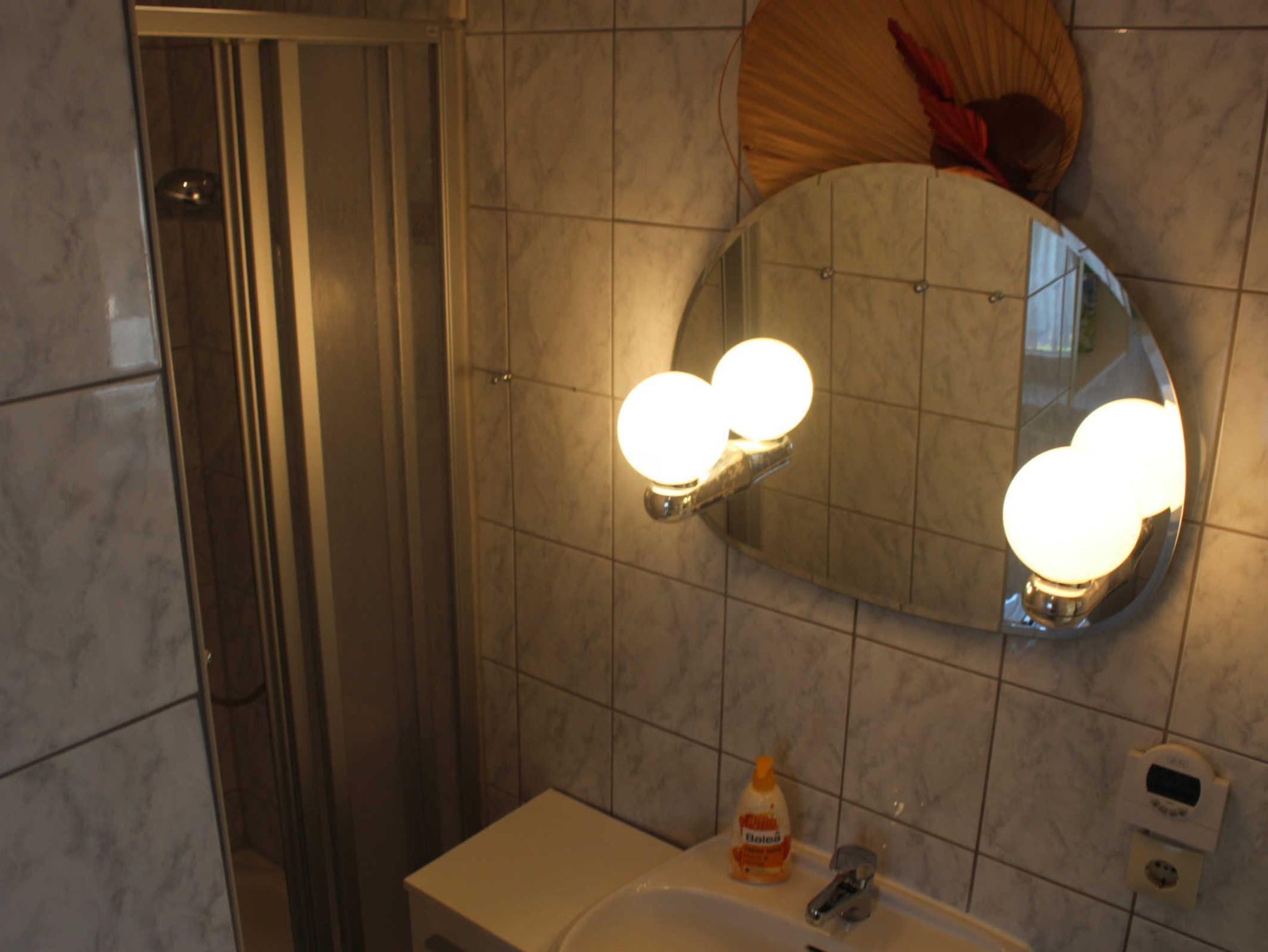 Im Badezimmer befinden sich eine Dusche, ein WC und eine Badezimmerkommode mit Spiegel und Waschbecken.