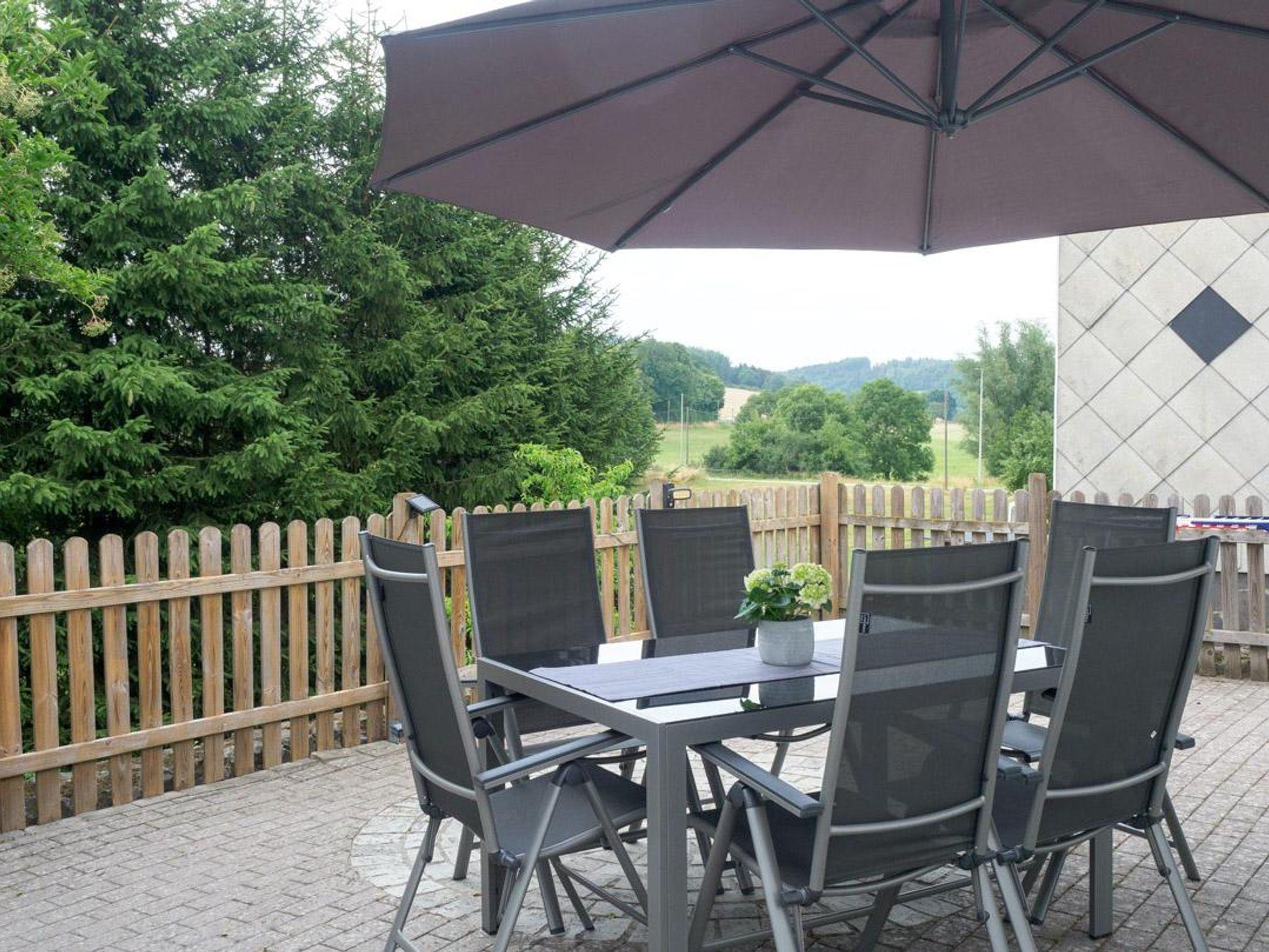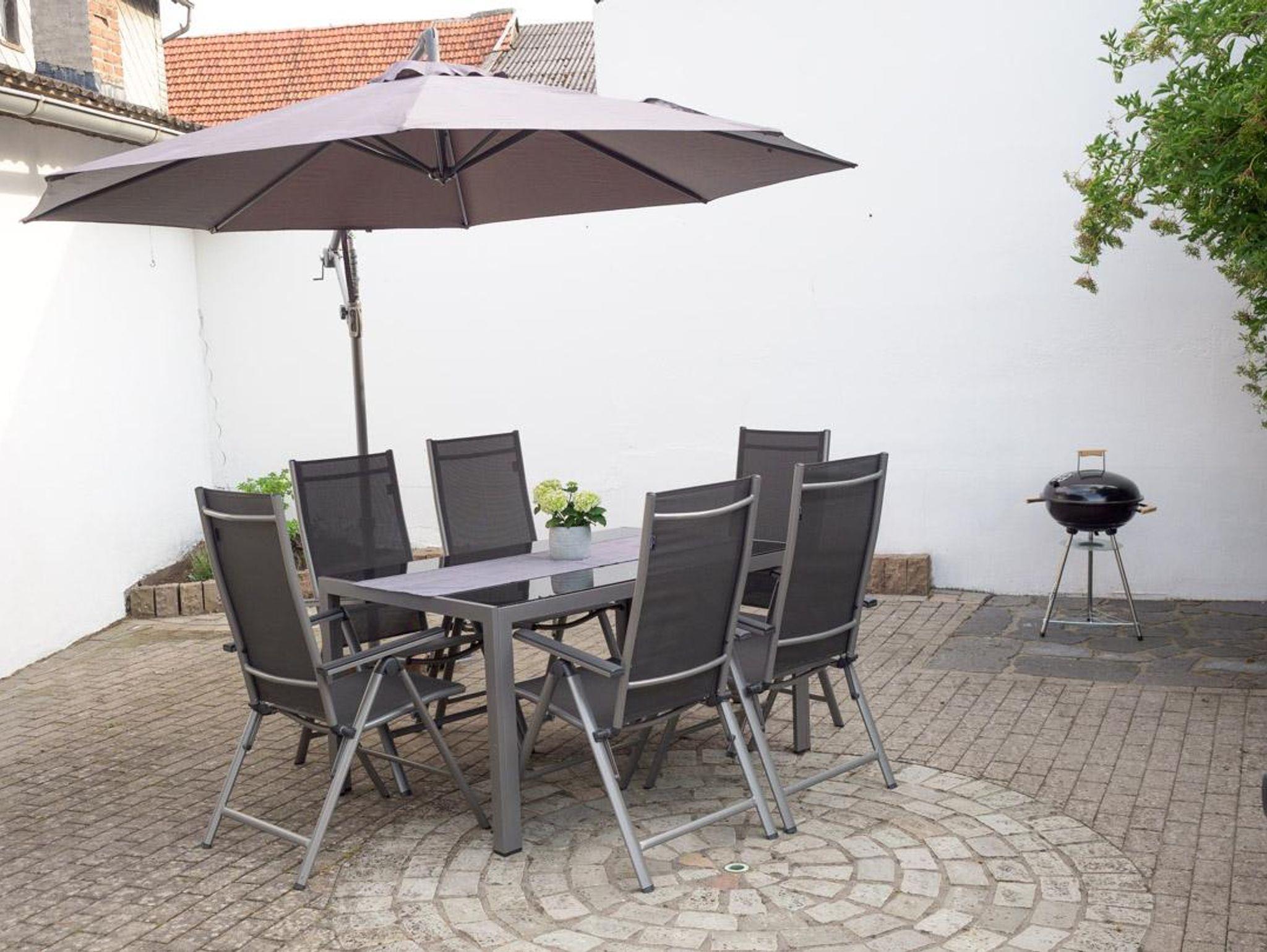 Auf der Terrasse befinden sich Terrassenmöbel (Ein Tisch mit sechs Stühlen, einen Sonnenschirm, eine Hollywoodschaukel und ein Holzgrill).