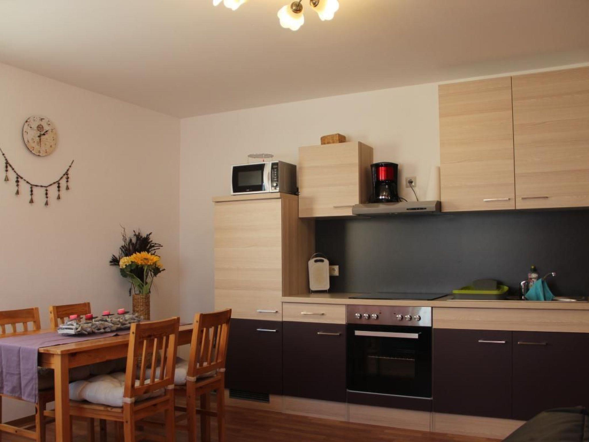 Our modern and functionally furnished holiday flat leaves nothing to be desired. The living room is equipped with a TV including satellite connection and a sofa bed with a spring core for an extra bed for two more people. In the bedroom, a wardrobe and two bedside tables including bedside lamps provide cosy comfort. The kitchen has everything you need for your daily needs, from a microwave, coffee machine and toaster to a kettle, crockery and cutlery.