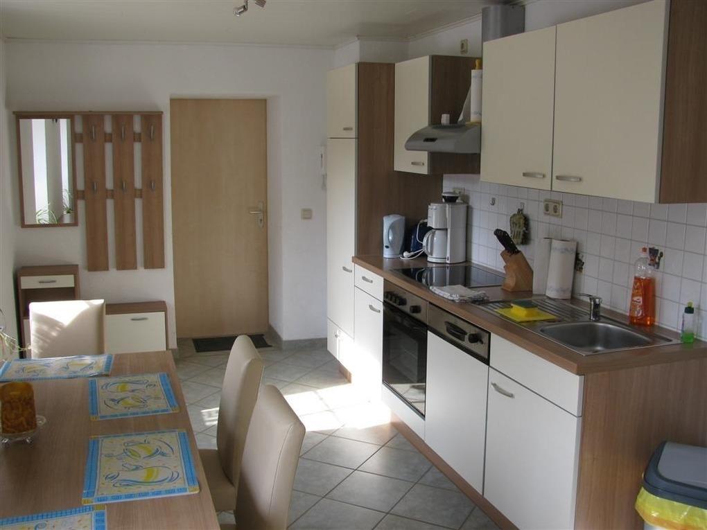 Die 55 qm große Ferienwohnung liegt im 1. Obergeschoss und verfügt über ein Wohnzimmer, ein Schlafzimmer, Küche und Badezimmer. Der Wohnbereich ist mit einer gemütlichen Couchgarnitur eingerichtet, welches auch als Schlafsofa fungiert. Zur Unterhaltung steht Ihnen ein TV zur Verfügung. Im Schlafzimmer befindet sich ein Doppelbett. Die Küche ist komplett ausgestattet mit einem Backofen, Cerankochfeld, Kaffeemaschine, Toaster, Wasserkocher, Kühlschrank. Im Badezimmer befinden sich Dusche und WC.