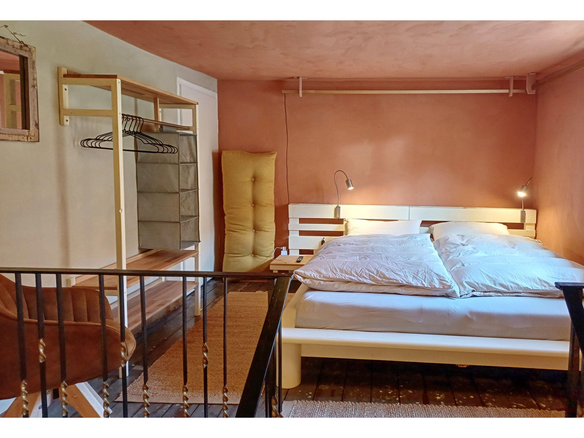 Ein Schlafzimmer (bezogenes Doppelbett 180x200cm, ein Babybett 60x90cm kann dazu gestellt werden).