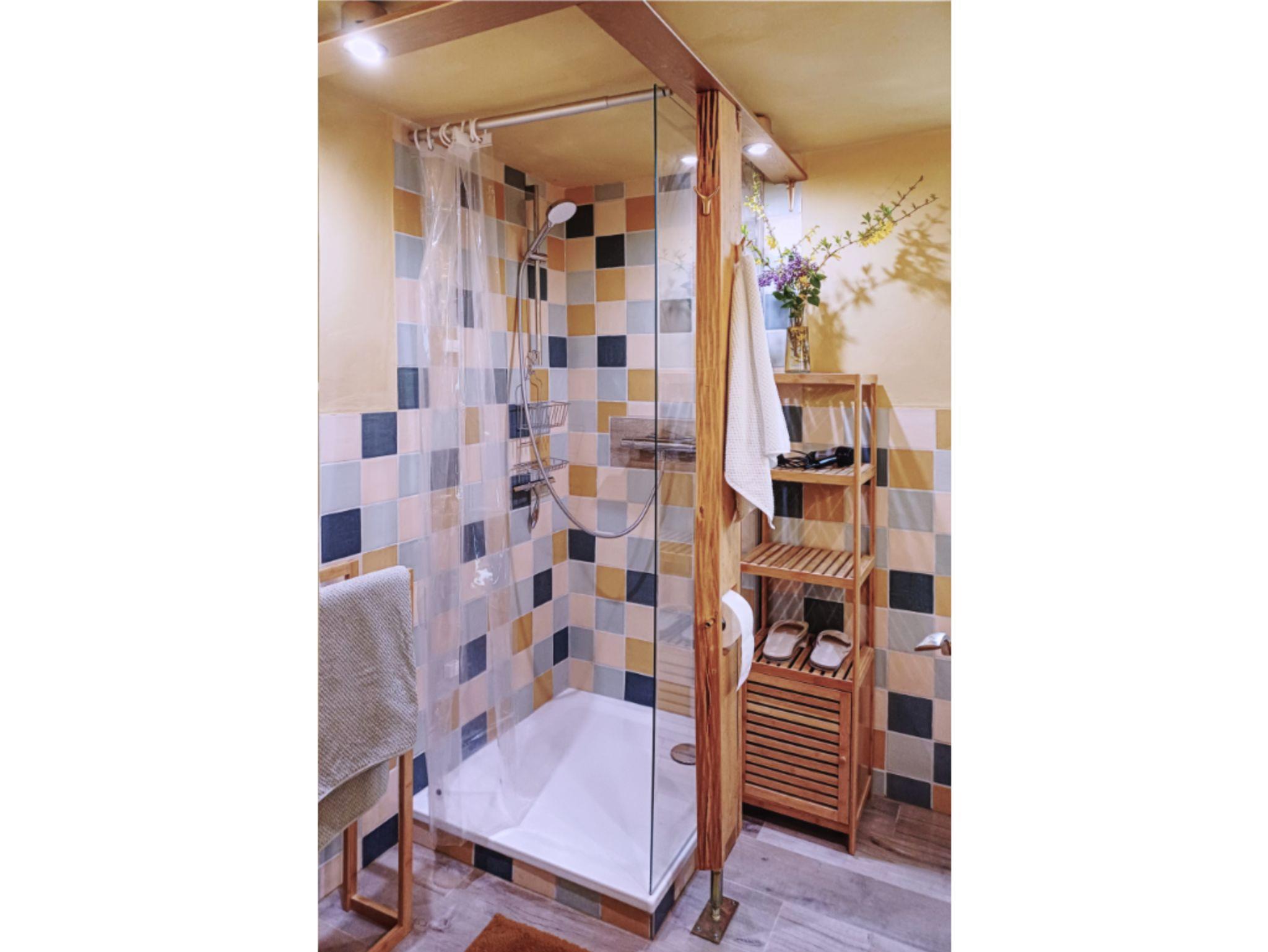 Ein Bad mit Dusche, Waschbecken, WC. Ausgestattet mit Badetüchern, Handseife, Fön.