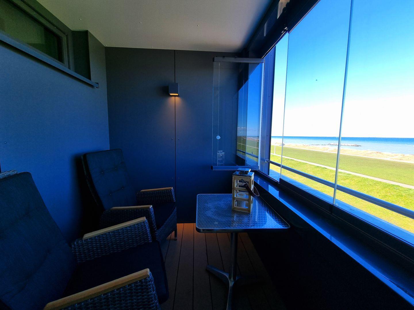 Loggia: zwei Hochlehner-Stühle / Tisch / Meerblick / schiebbare Fensterelemente