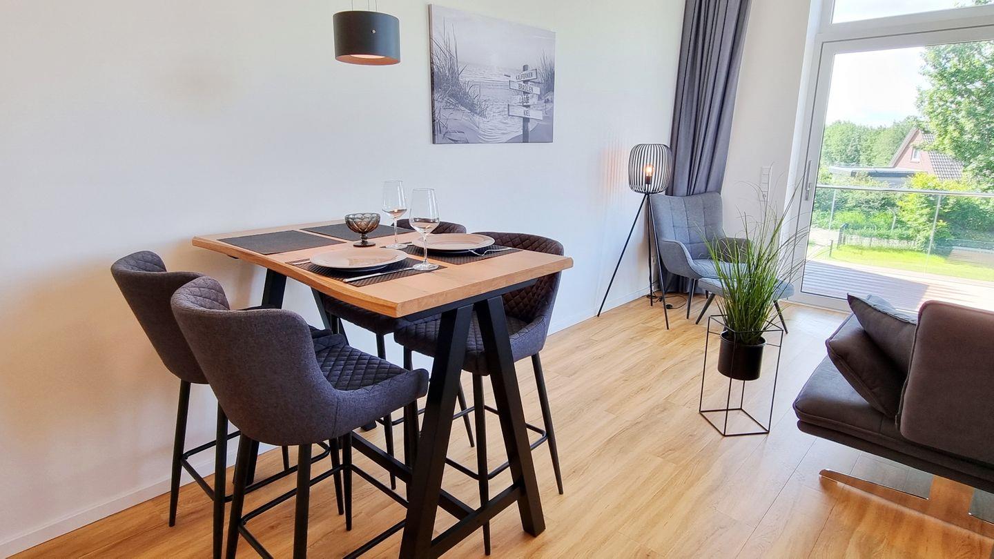 Auf dem großen Sonnenbalkon in Südlage, startet und endet jeder Tag mit Entspannung und Meeresrauschen. Der Balkon zieht sich in L-Form um die Hauswand, so dass ein schöner Meerblick auf die Ostsee sichtbar wird. Neben der Sitzgruppe steht ein Hochlehner mit Fußschemel bereit.