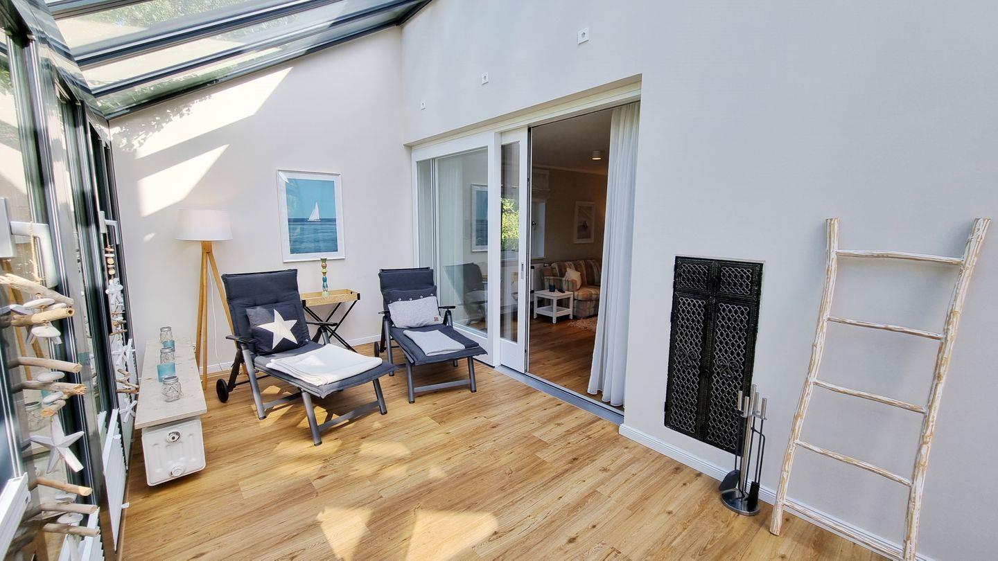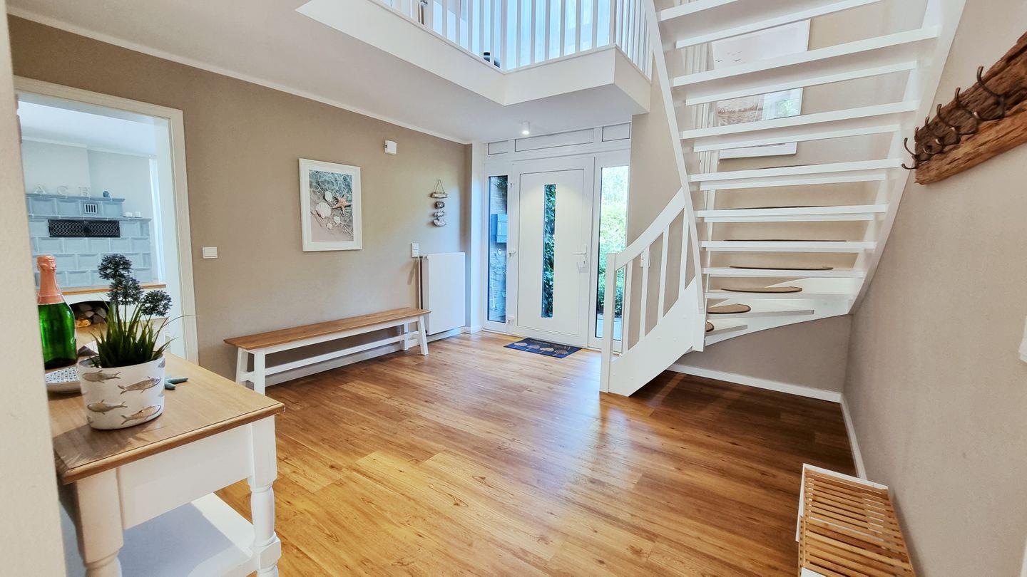 Auch an stürmischen Tagen sorgt der stylische Kaminofen für wohlige Wärme und der angrenzende Wintergarten eignet sich hervorragend zum Abschalten bei einem guten Buch. Damit der erholsame Schlaf nicht zu kurz kommt, stehen insgesamt 3 Doppelbettzimmer mit Boxspringbetten zur Verfügung, on top haben zwei der Schlafzimmer ein Bad en Suite. Insgesamt befinden sich 3 Badezimmer im Haus, davon zwei Duschbäder und ein Wannenbad, so hat jede Partei ein Badezimmer für sich, wobei sich ein Duschbad im EG befindet.