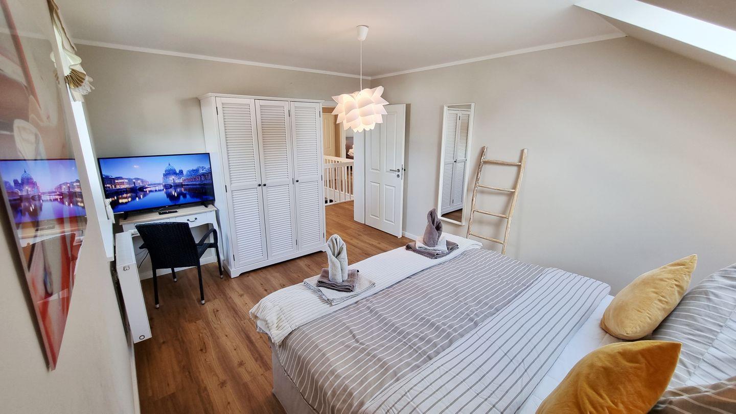 Schlafzimmer III: Boxspring-Doppelbett (180x200cm) / Schrank / Fernseher / Verdunkelungsgardinen / Velux-Fenster